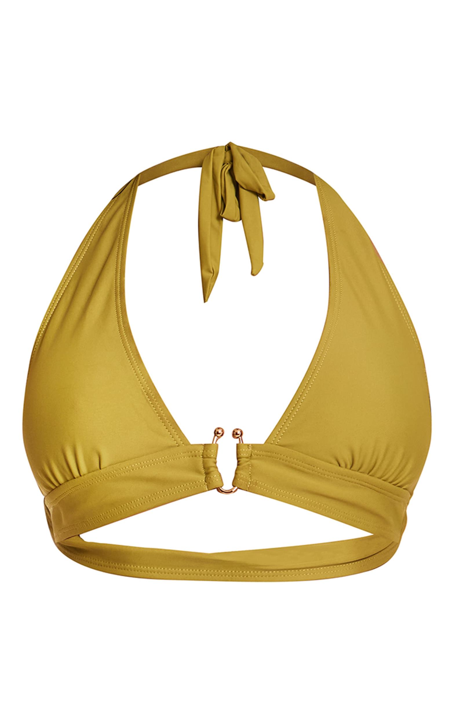 Bring a touch of luxe to your look in this olive gold trim halter neck triangle bikini top. Constructed from olive fabric with gold trim and a halter neck triangle design for a standout look. Team with your beach day accessories and a pair of sandals for a chic finish. Length approx 29cm/11.5inch (Based on sample size US 4)Model wears size UK 8/ EU 36/ AUS 8/ US 4Model Height - 5ft 8inchp]:!mb-4inch>Brand: PrettyLittleThingCategory: SwimwearProduct type: Triangle Bikini TopColor: OliveMaterial: SwimOccasion: Day