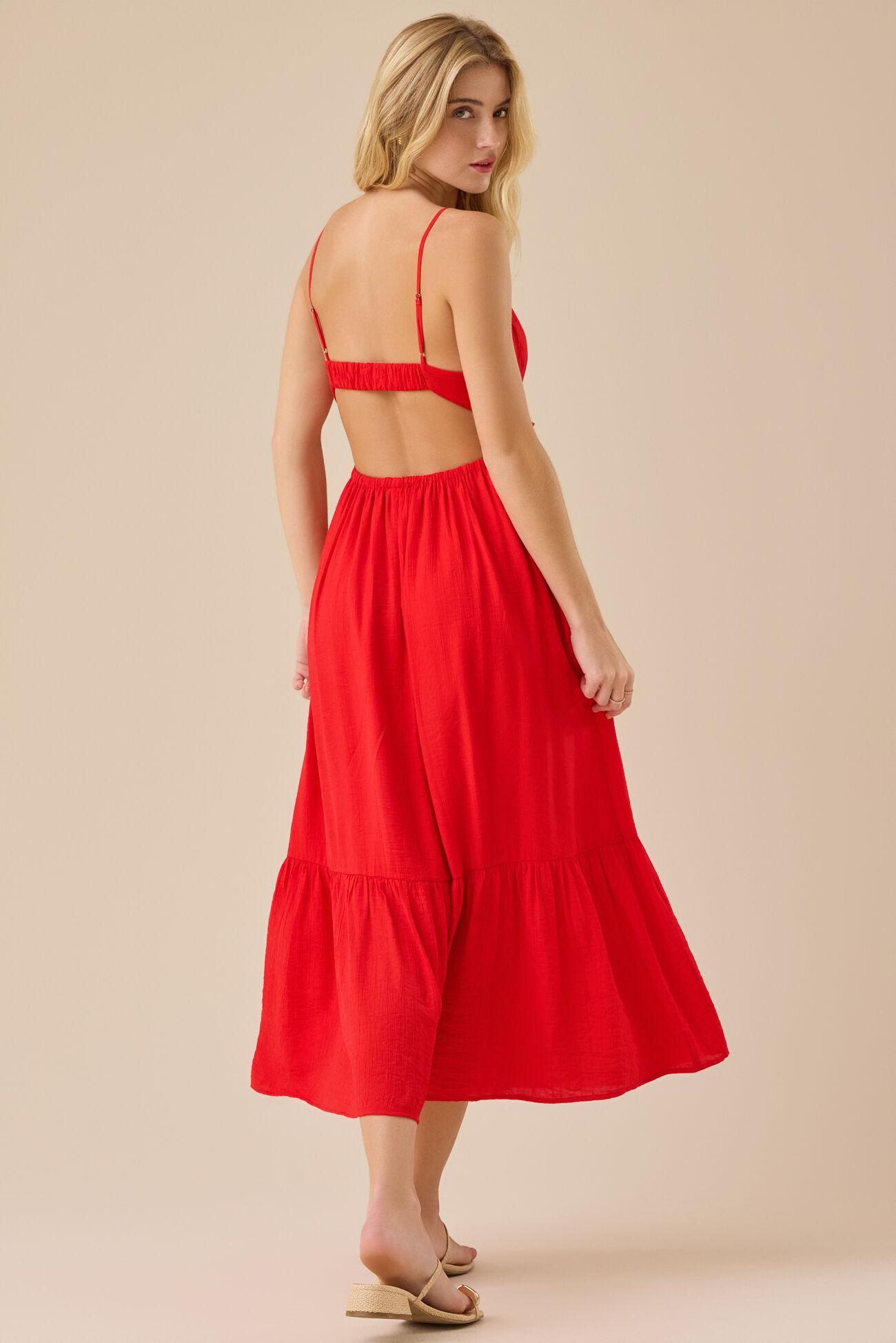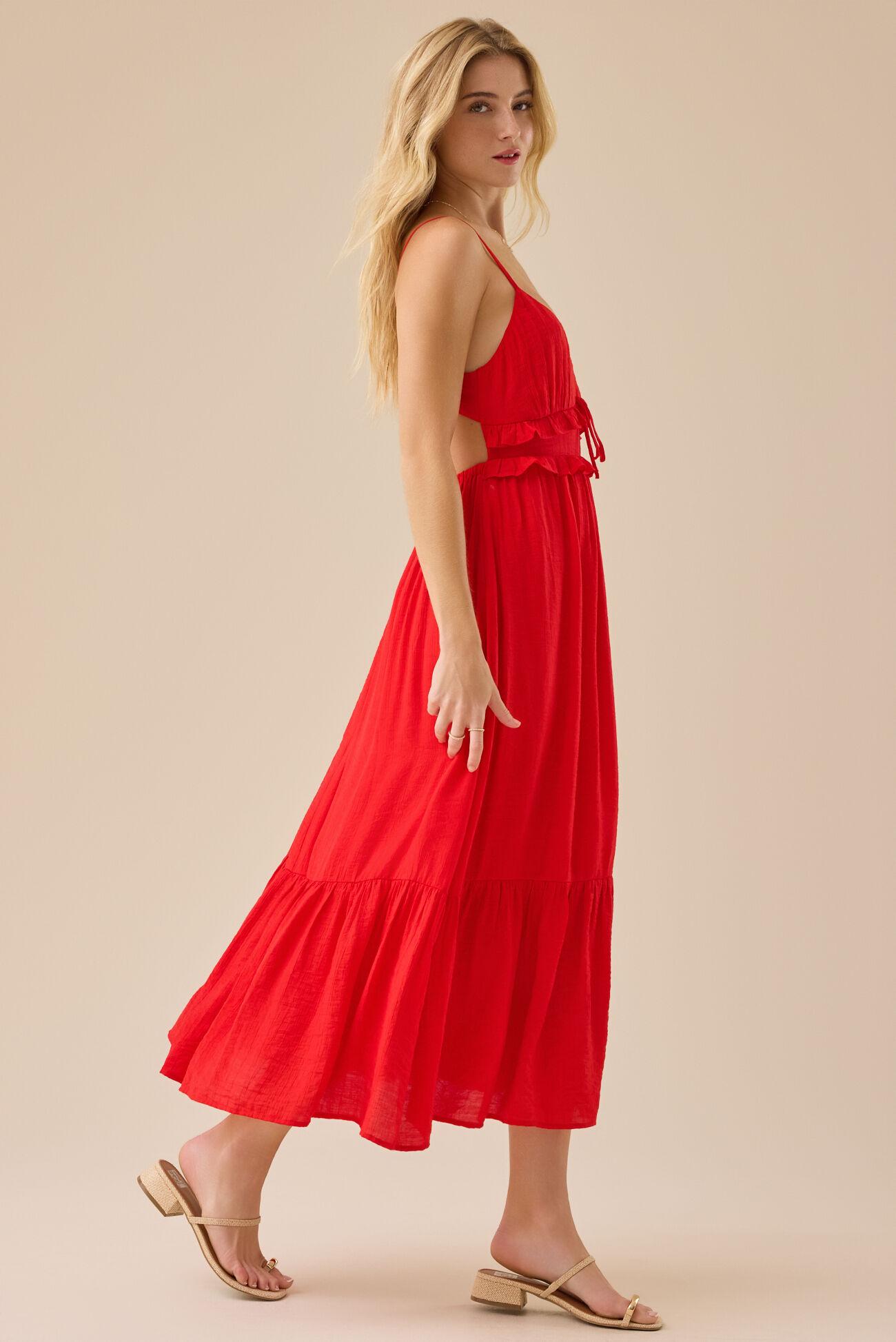 Off-Shoulder Lace-Up A-Line Midaxi Dress in Red