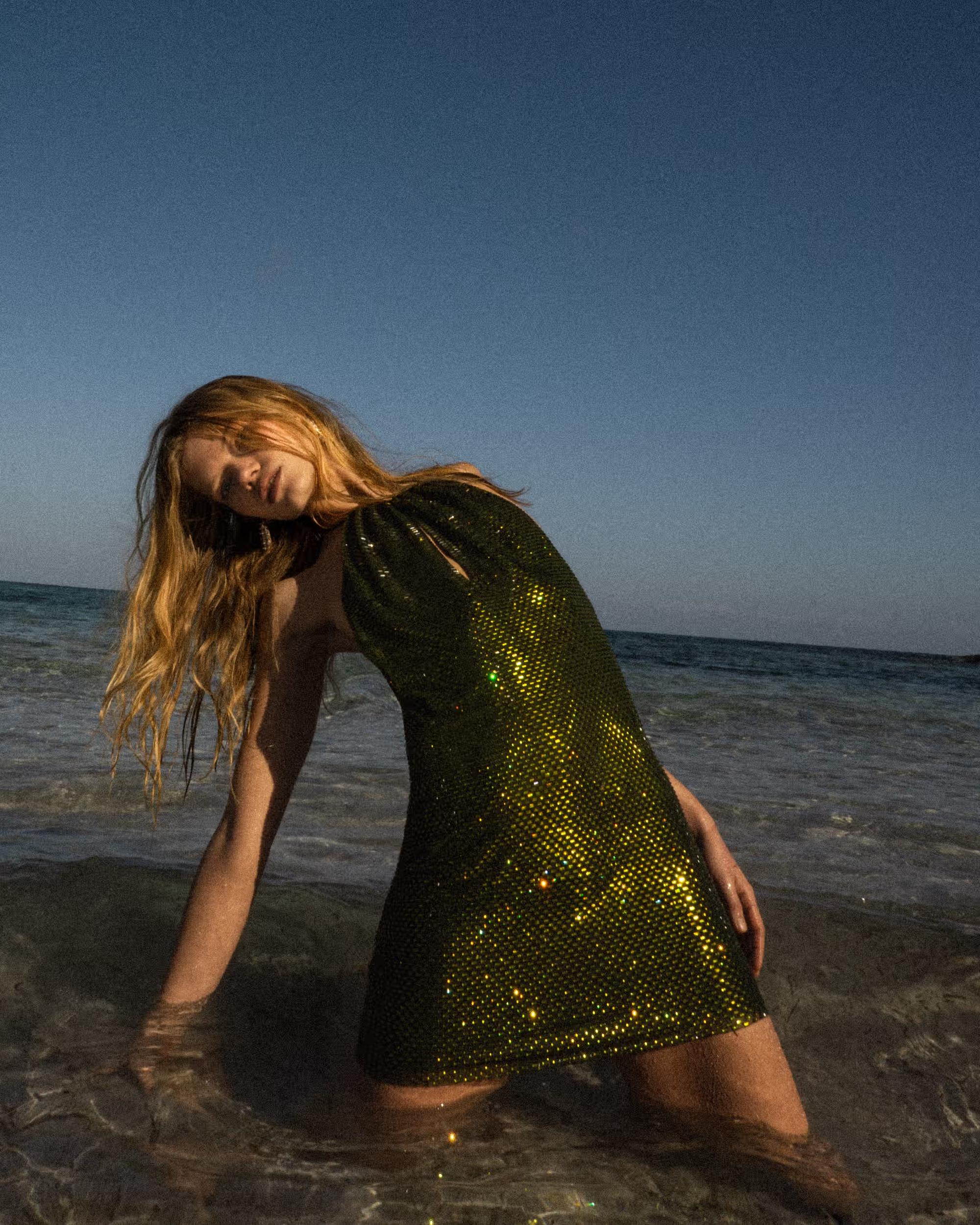 A guaranteed showstopper, this mini dress shimmers all-over with olive rhinestones. A halter neckline and plunging backless cut reveal tantalising flashes of skin – ready for after-dark adventures.True to sizeFabric has stretchConcealed zip closure at backLow cut backHalter neckModel is 5ft10/178cm and wears a size UK 6
