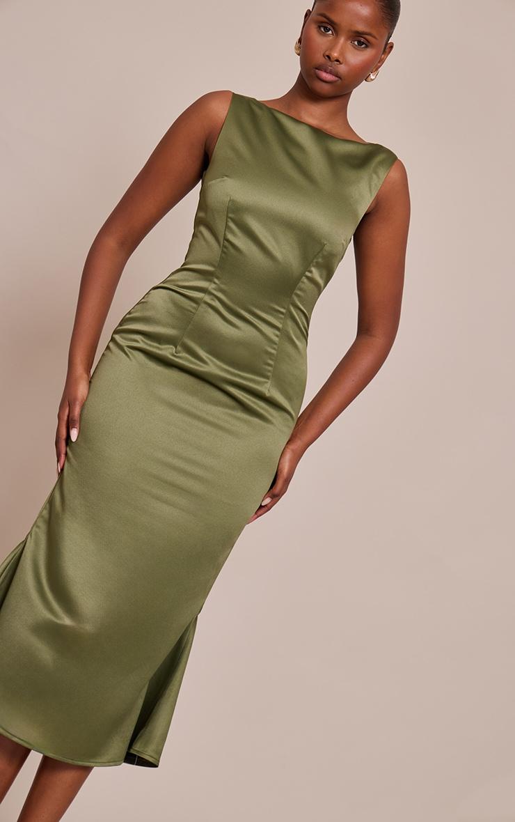 Bring sophistication to your edit with the olive satin boat neck fishtail midaxi dress. Designed in an olive satin fabric, it showcases a boat neckline, fitted bodice, and fishtail midaxi silhouette that flows elegantly. Perfect for evening occasions or formal events, this dress ensures you stand out. Team with slip on mule heels and a clutch bag for an effortlessly chic finish.Length approx 134.5cm/53inch (Based on sample size US 4)Model wears size UK 8/ EU 36/ AUS 8/ US 4Model Height - 5ft 9inchp]:!mb-4inch>Brand: PrettyLittleThingCategory: DressesProduct type: Shift DressColor: OliveMaterial: SatinDesign: PlainNeckline: Boat NeckSleeves: SleevelessOccasion: Occasion