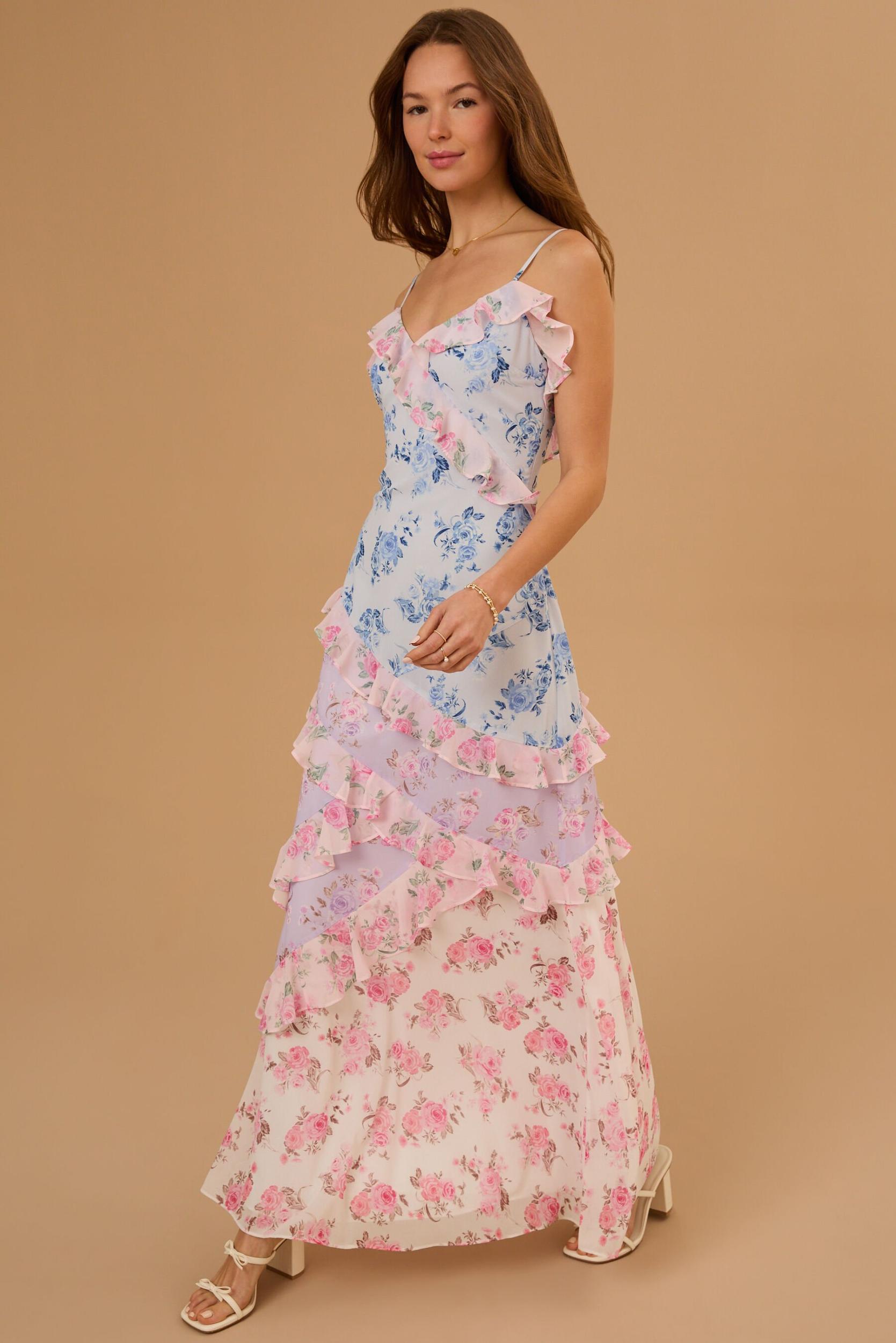 Designed with exquisite ruffle details that cascade beautifully, this dress offers a touch of romance and sophistication. The soft, flowing fabric drapes gracefully over your silhouette, while the stunning floral print adds a vibrant, fresh feel to your look.