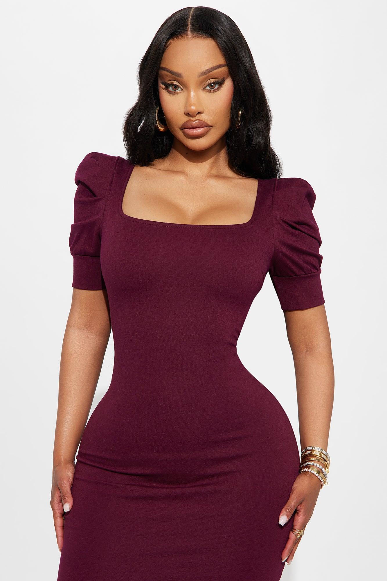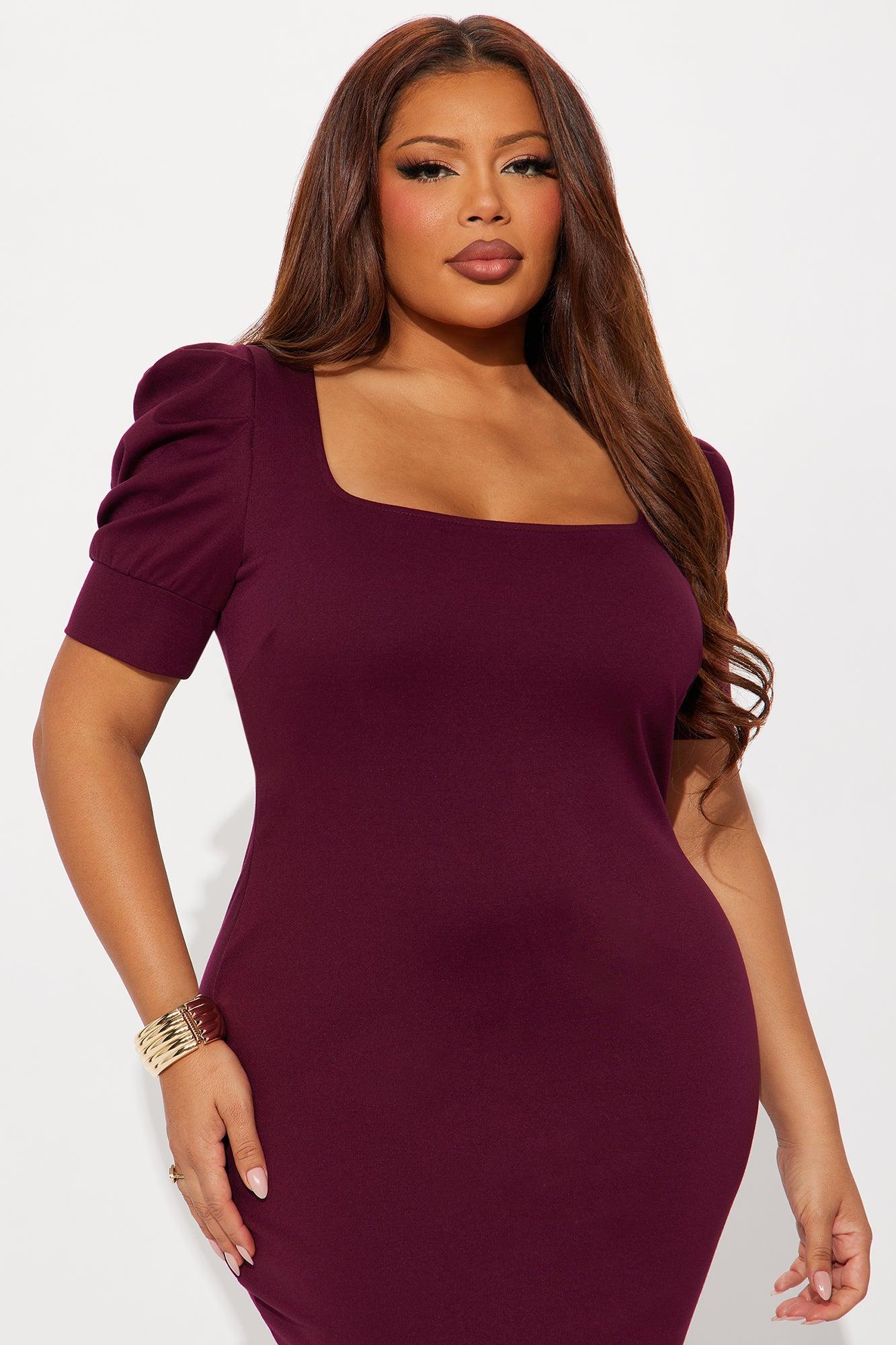 Available In Wine. Midi Dress Square Neckline Short Ruched Sleeve Peplum Skirt Hidden Back Zipper Stretch Length Measured Flat = 47" Self : 68% Rayon 29% Nylon 3% Spandex Imported California Proposition 65WARNING: Cancer and Reproductive Harm - www.P65Warnings.ca.gov.
