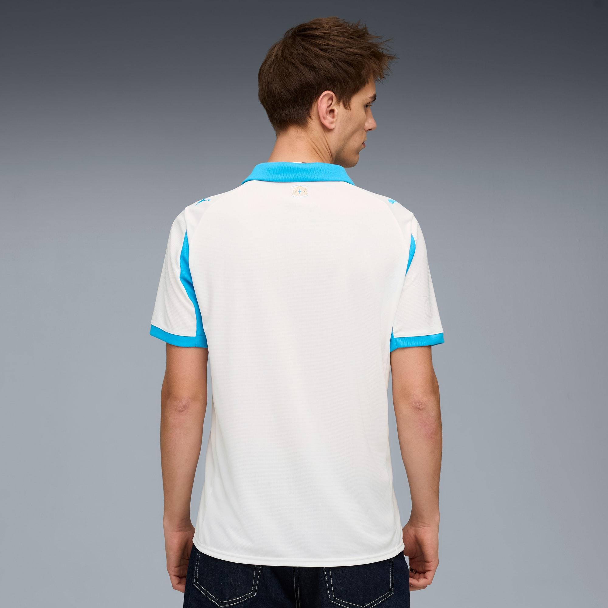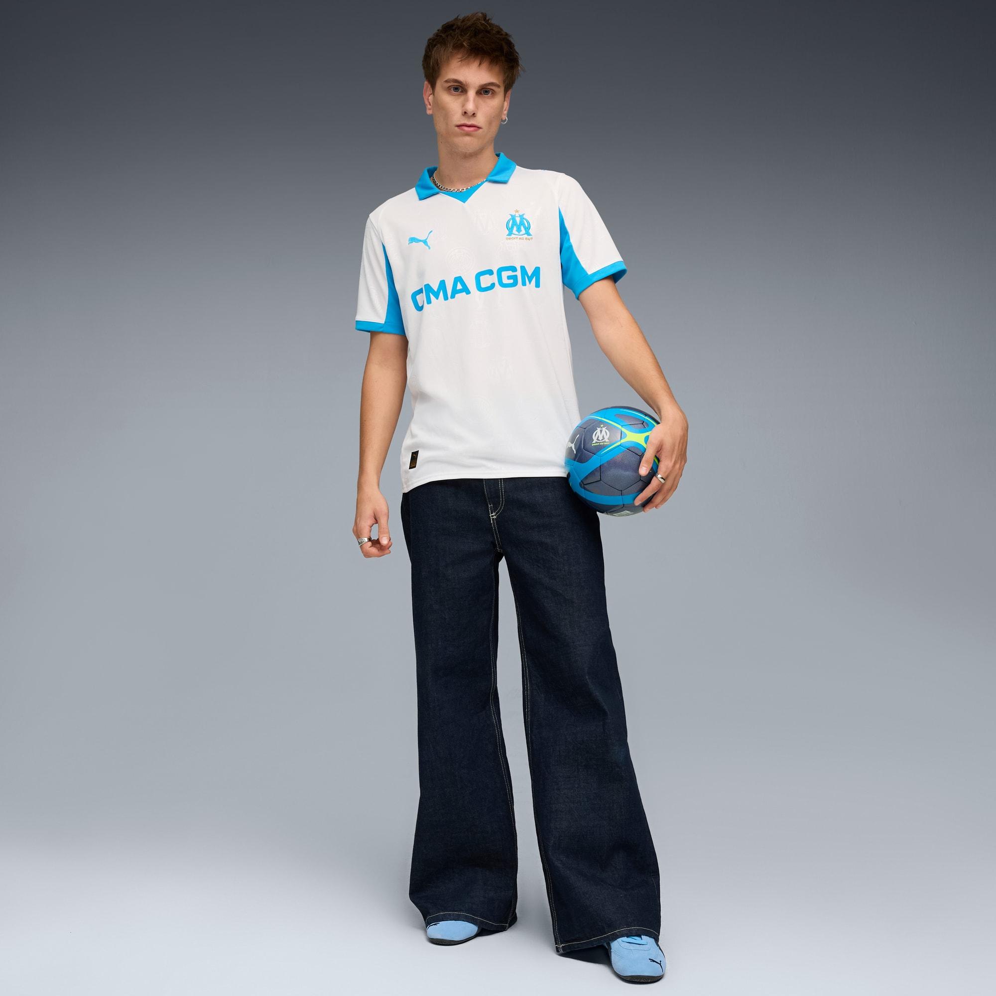 Show your support for Olympique de Marseille with the official 25/26 Home jersey. It features a clean and classic design with a predominantly white color and light blue accents. The collar and sleeve cuffs add a touch of elegance, while the PUMA Cat logo and club crest are prominently displayed on the chest. Crafted with PUMA's dryCELL technology, this jersey ensures maximum comfort and performance, keeping you cool and dry whether you're cheering from the stands or playing on the field.dryCELL: Highly functional materials draw sweat away from your skin and help keep you dry and comfortable during exerciseAs part of the RE:FIBRE program, this garment is made of at least 95% recycled material from textile waste and other used materialsFit: RegularMain material: Double face jacquardNeck: Crew neckShort sleevesLength: RegularWorn by the players during the 25/26 seasonClub and PUMA branding details
