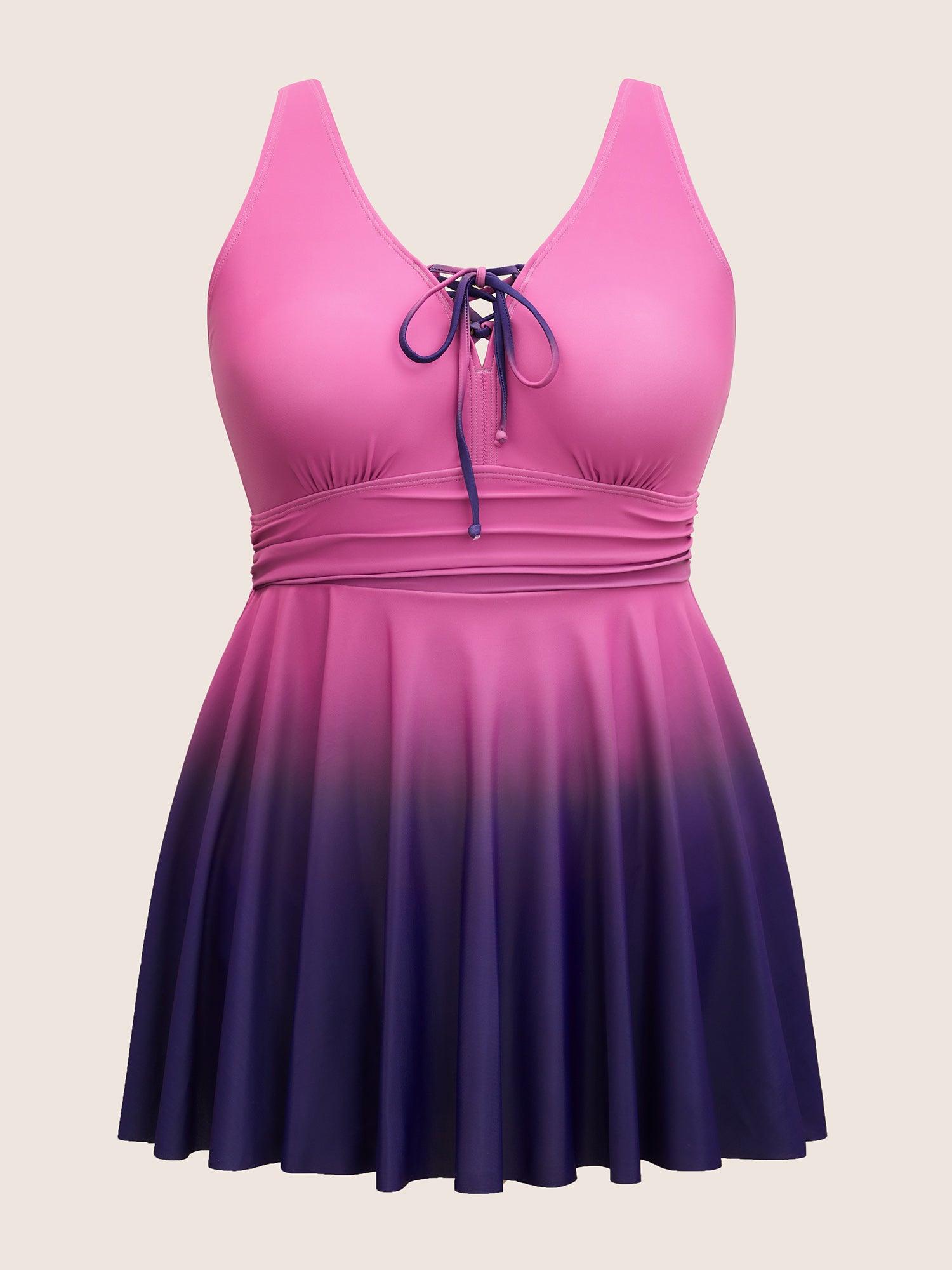 Shop Ombre Contrast Ruched Lace Up Swim Dress now and redefine your style with confidence at BloomChic. Tailored for mid and plus-size women. This trendy Swimwear Women, sizes 10-30. Season:Summer;Color:RedViolet;Bra Type:Wireless;Coverage:Full;Waist Design:High Rise;Neckline:V-neck;Sleeve Type:Sleeveless;Pattern Type:Ombre;Pocket:No-pocket;Belt:No-belt;Chest pad:Removable Padding;Lining:Lining