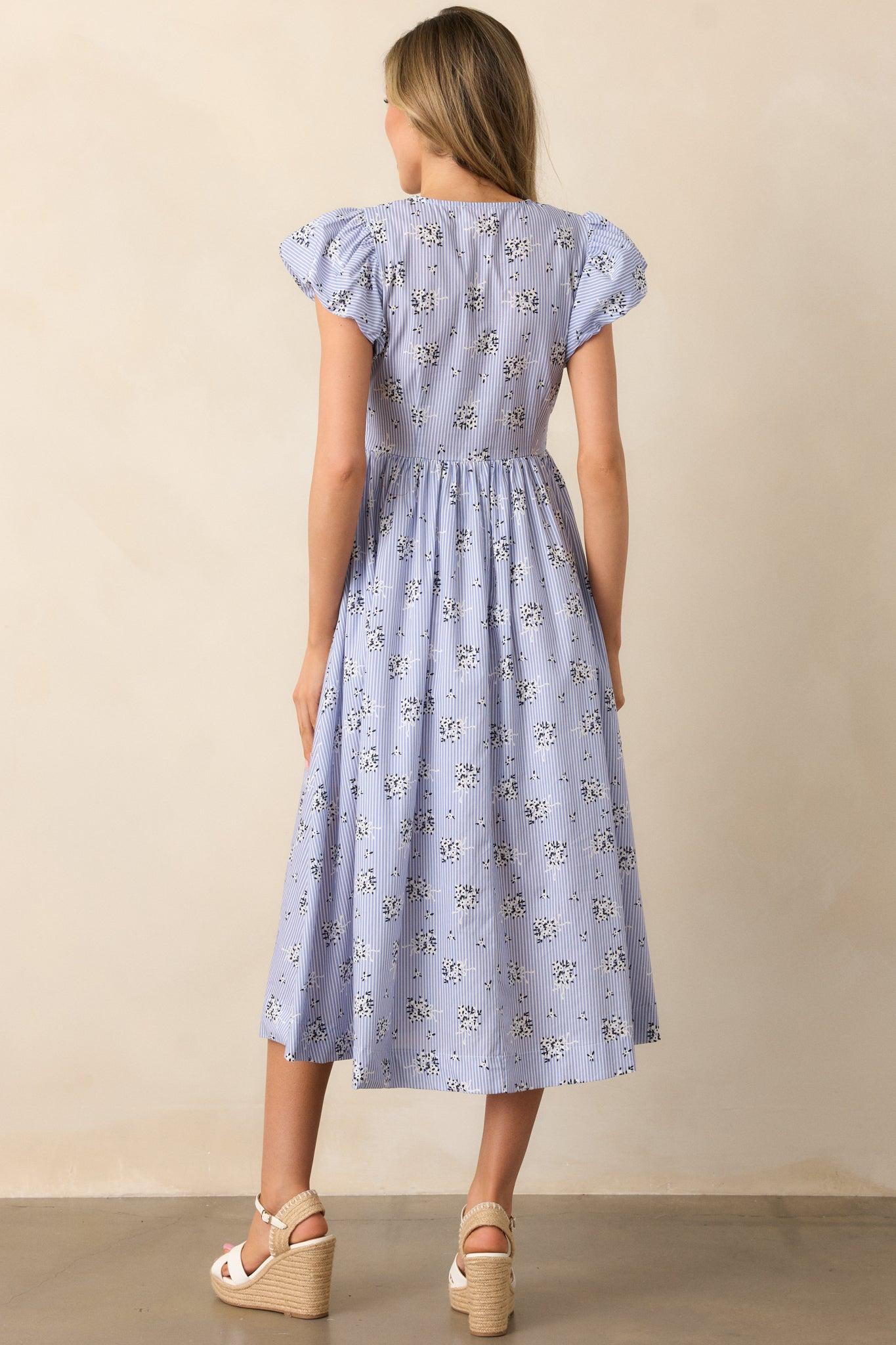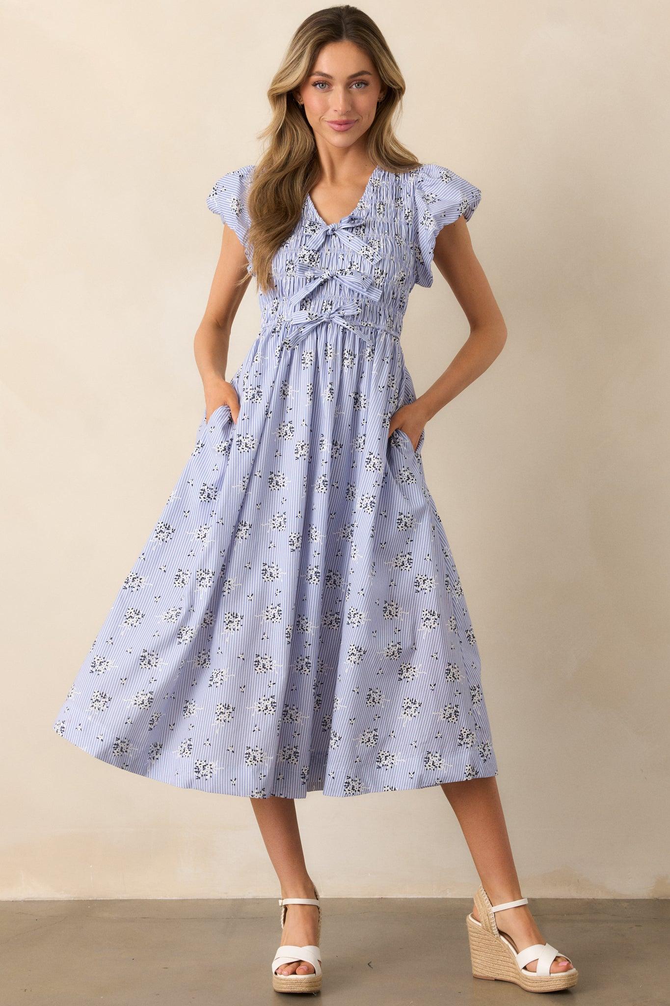 Indulge in effortless style with our On A Good Note Blue Stripe Floral Cotton Midi Dress! Made with soft and breathable cotton, this dress features beautiful blue stripes and a delicate floral pattern. Perfect for any occasion, this dress will keep you feeling comfortable and looking stunning. Elevate your wardrobe with this must-have dress today! This blue dress features three self-tie bows, puff sleeves, a smocked front panel, and two functional side pockets.