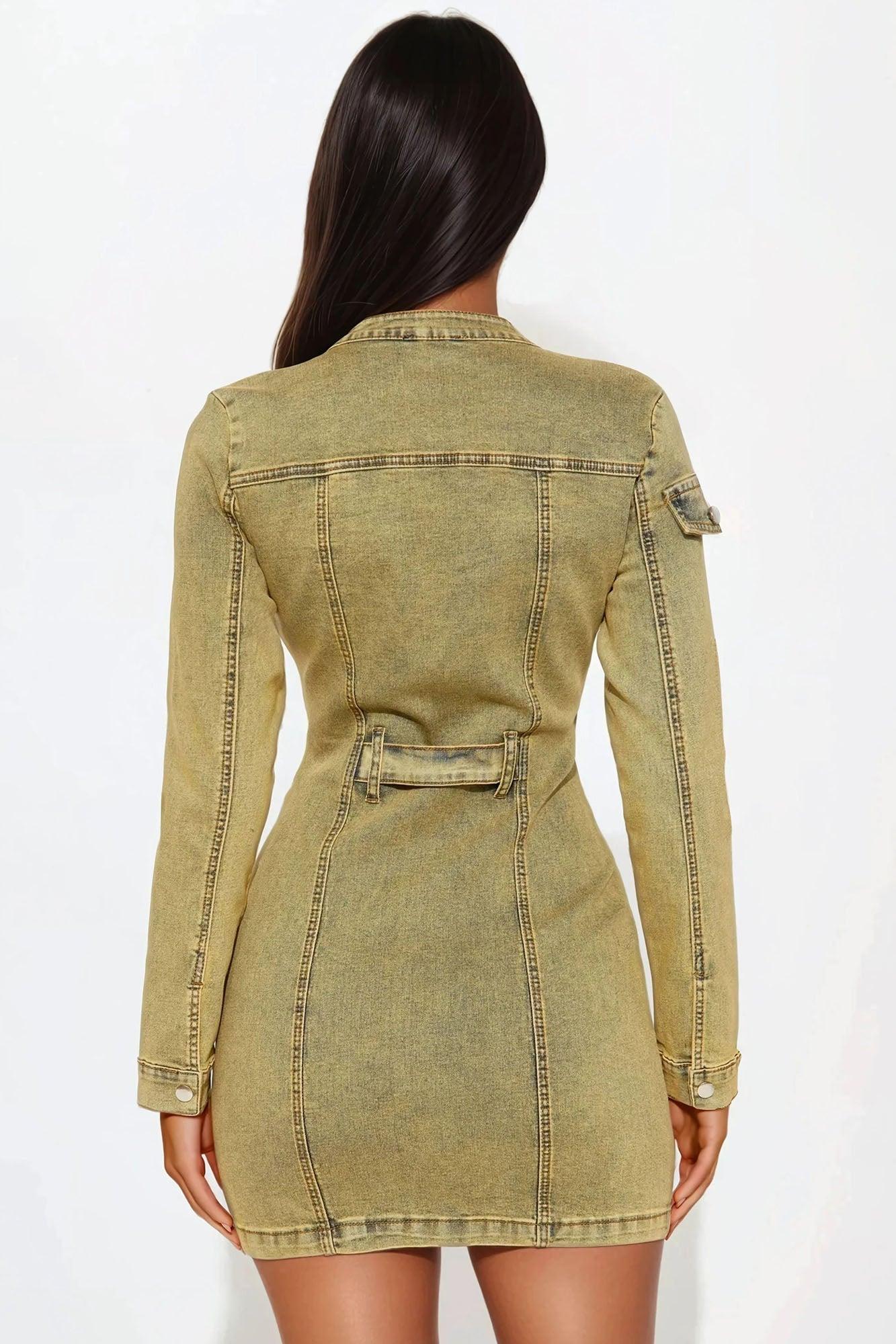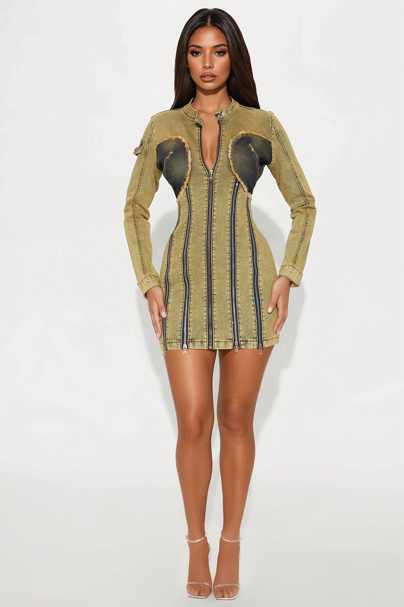 Available In Vintage Wash. Denim Micro Mini Dress Mock neckline Long sleeves Zip front Faux pockets Stretch Length measured flat = 32" Disclaimer: Due To The Specialized Wash & Distressing Process, Each Garment Is Unique. Self / Contrast 96% Cotton 2.5% Polyester 1.5% Spandex Imported California Proposition 65WARNING: Cancer and Reproductive Harm - www.P65Warnings.ca.gov.