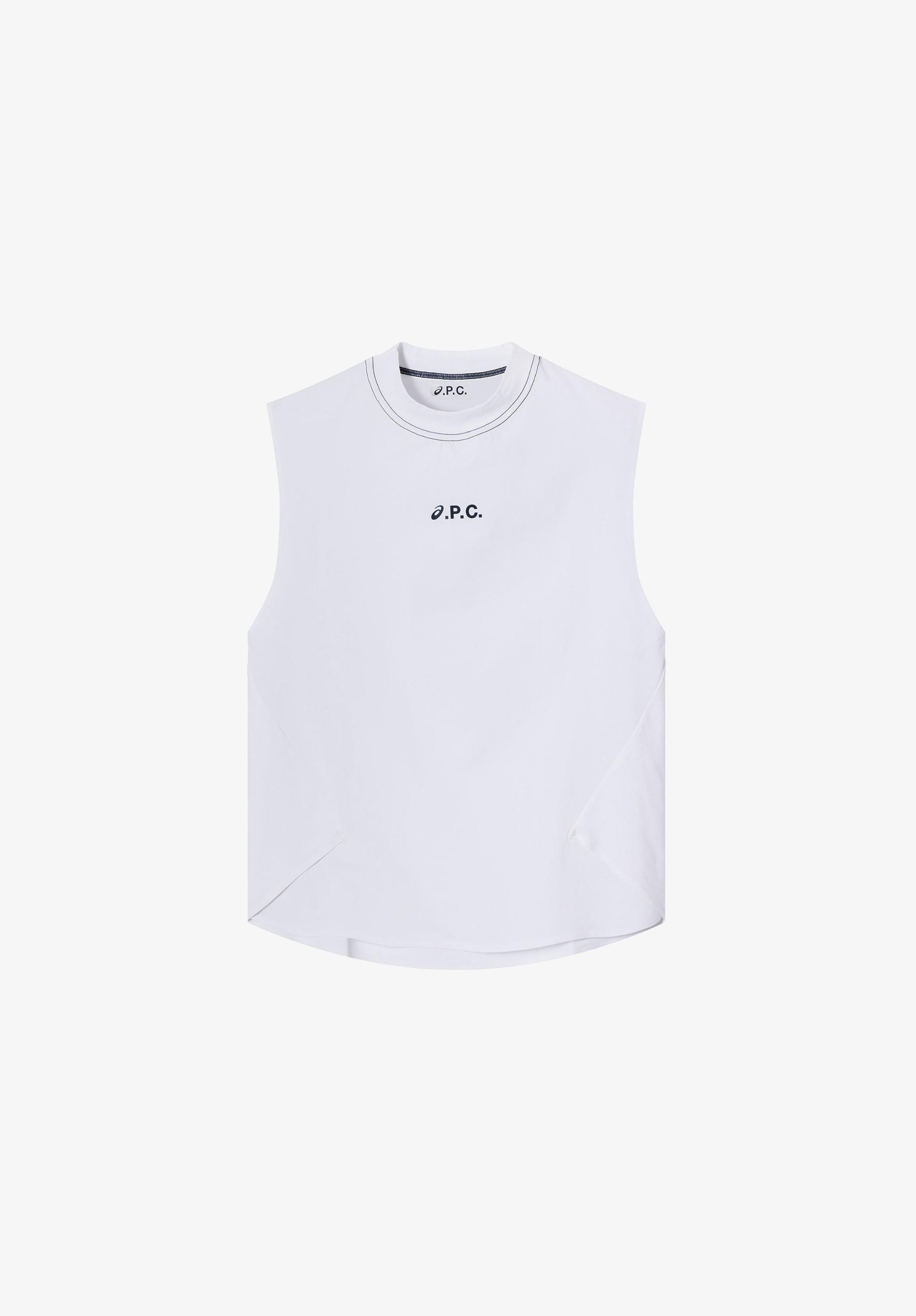 A.P.C. x Asics top.- Moisture-wicking stretch material designed for movement. - Straight, flowing cut. - Round neckline with contrasting double topstitching. - Sleeves cut at the shoulder. - A.P.C. and Asics logo in front. - Pleated sides for easier movement. - 35% recycled polyester.