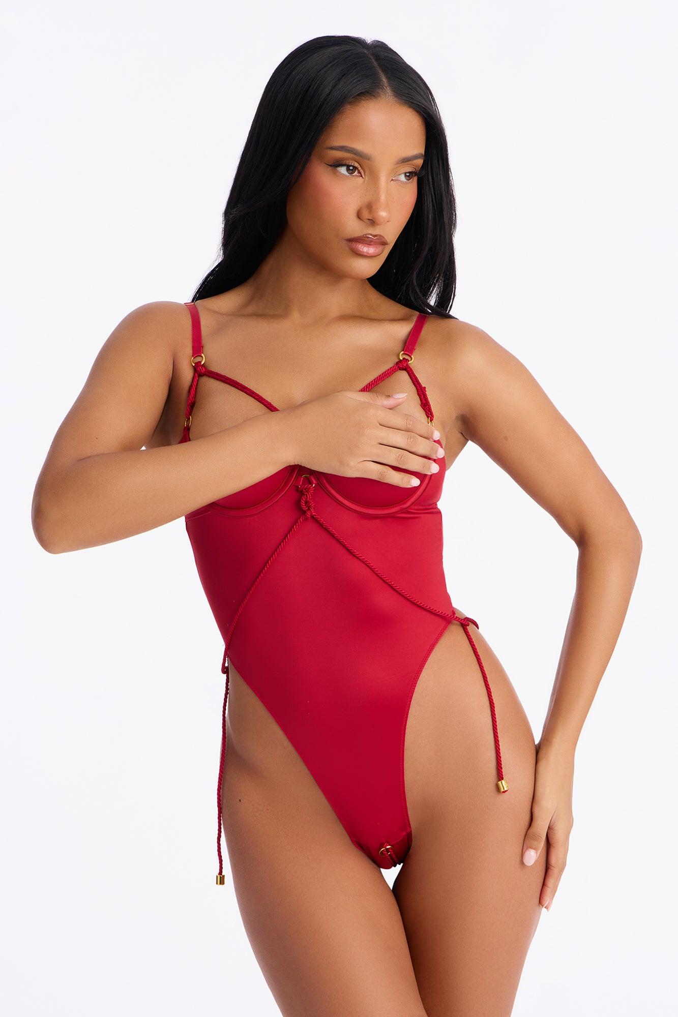 Available In Red. Satin Teddy Adjustable Straps Open Cup Detail Underwire Strappy Rope Detail O-Ring Detail Crotchless Final Sale Self : 76% Nylon 24% Spandex Imported