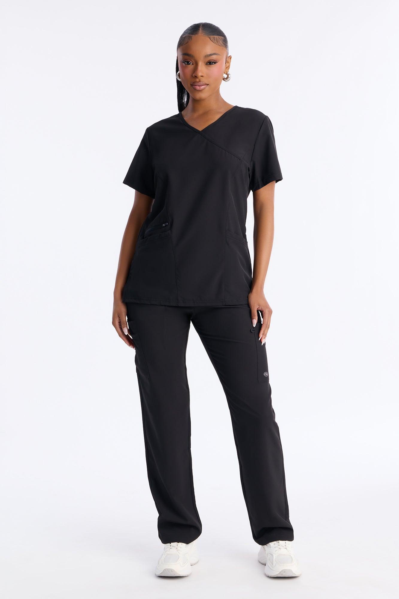 On High Alert Stretch Faux Wrap V Neck Scrub Top - Black Female
