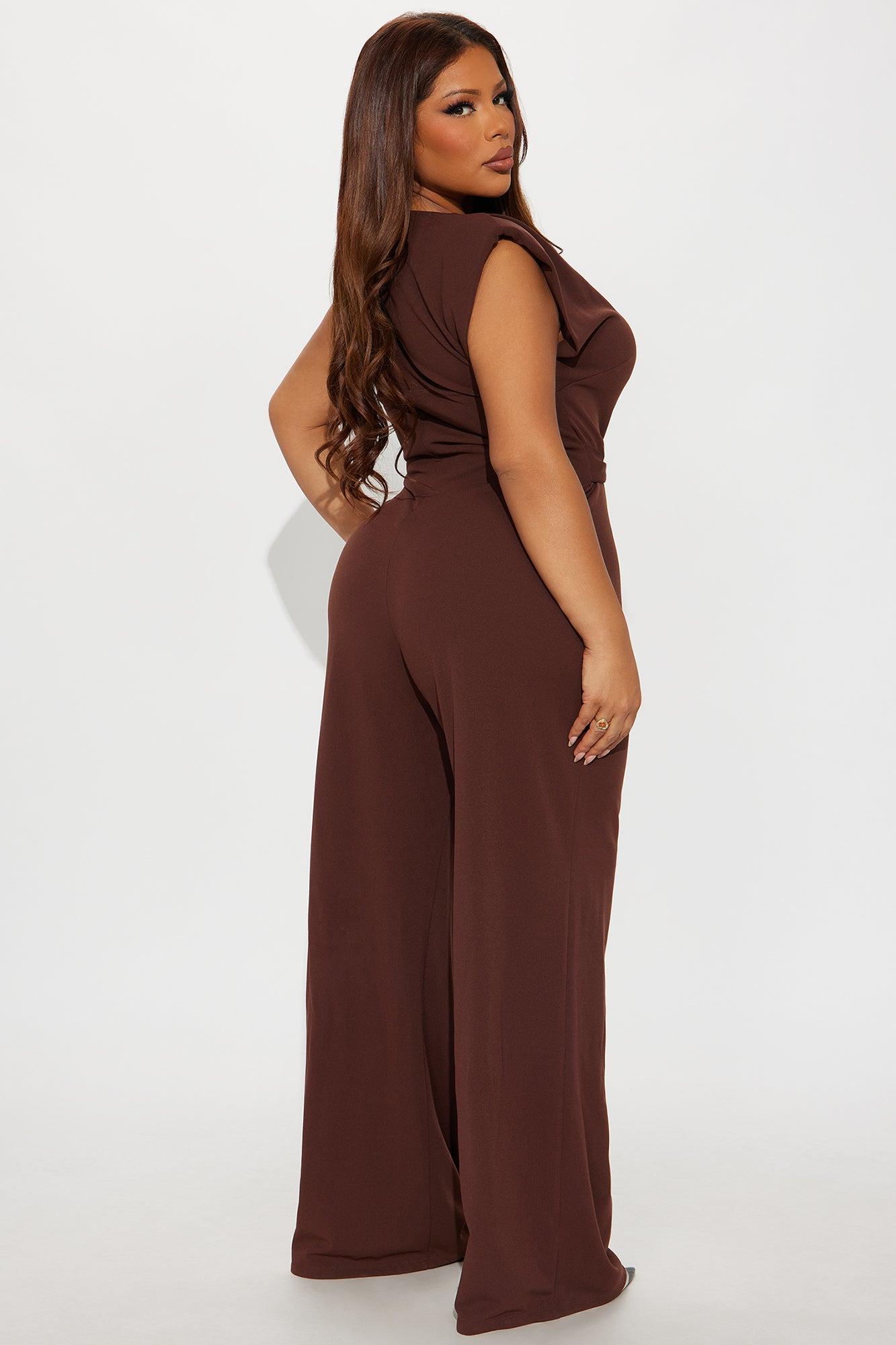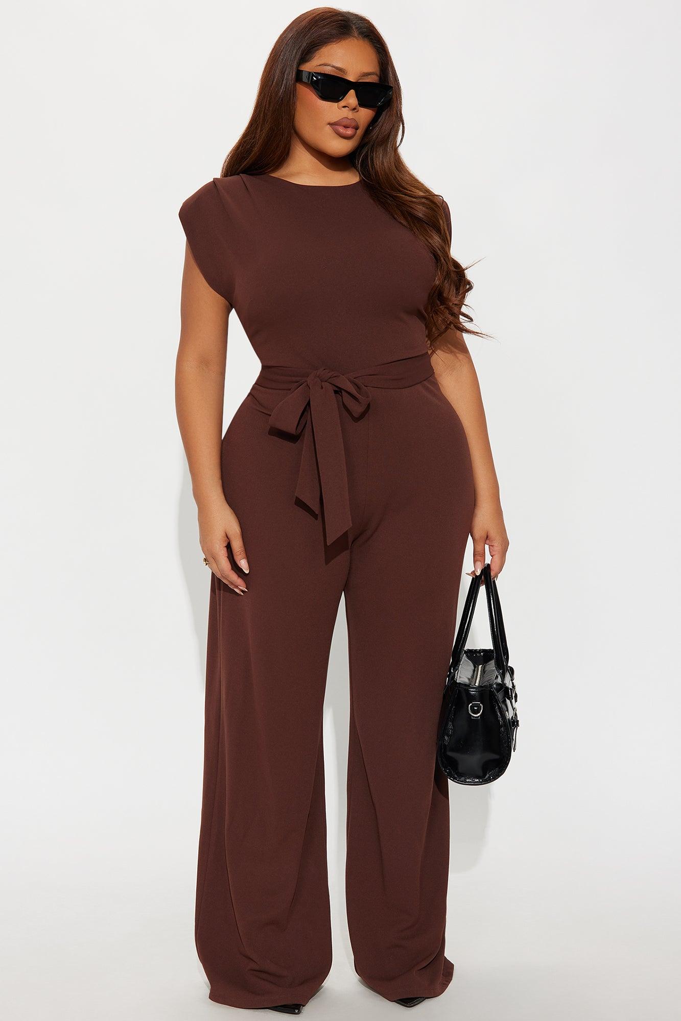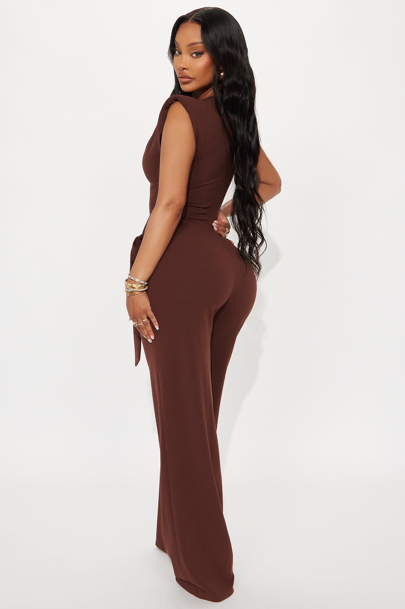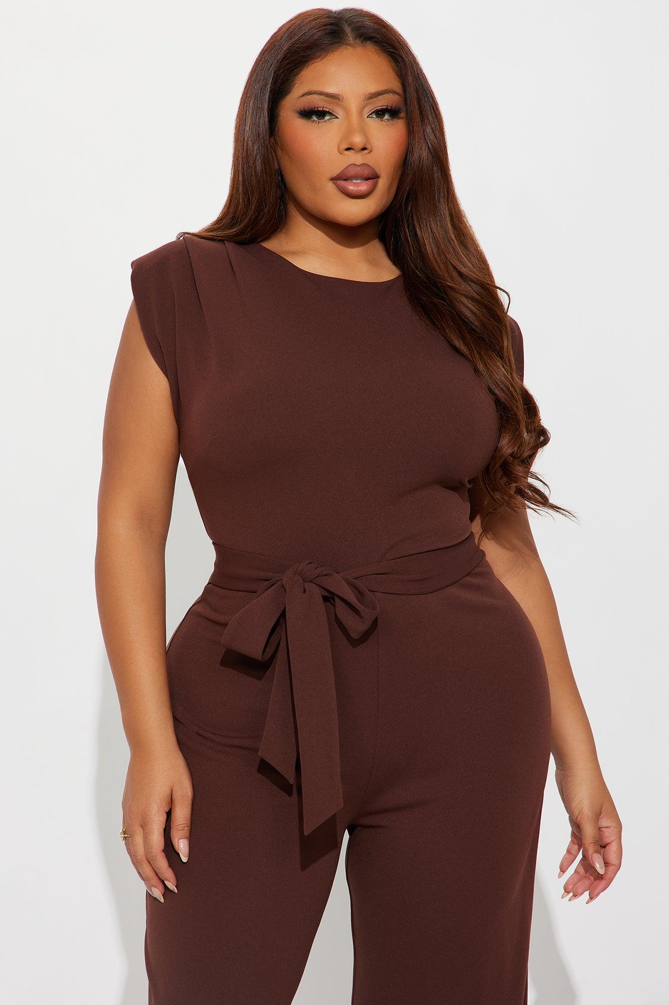 Available In Black, Chocolate, Copper, Olive And Red. Jumpsuit Sleeveless Shoulder Pads Functional Back Zipper Adjustable Tie Waist Wide Leg Pant 33" Inseam Stretch 95% Polyester 5% Spandex Imported
