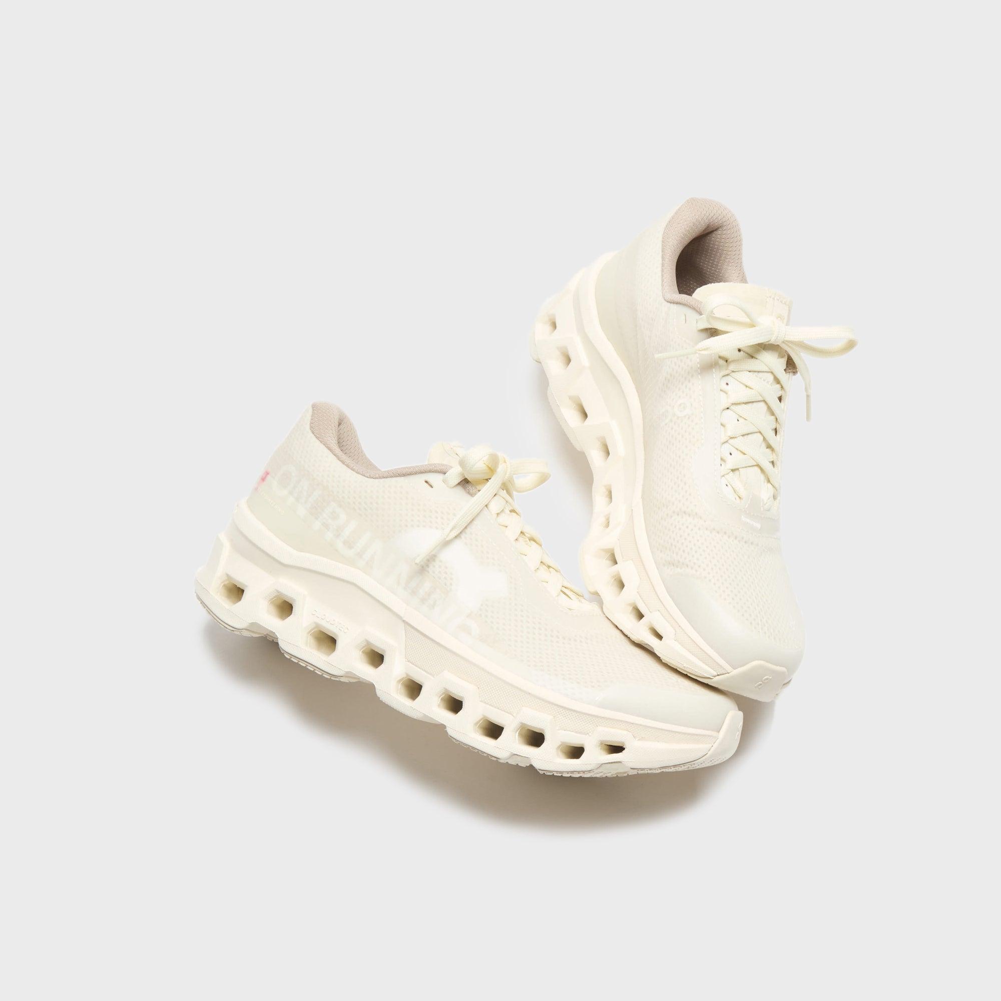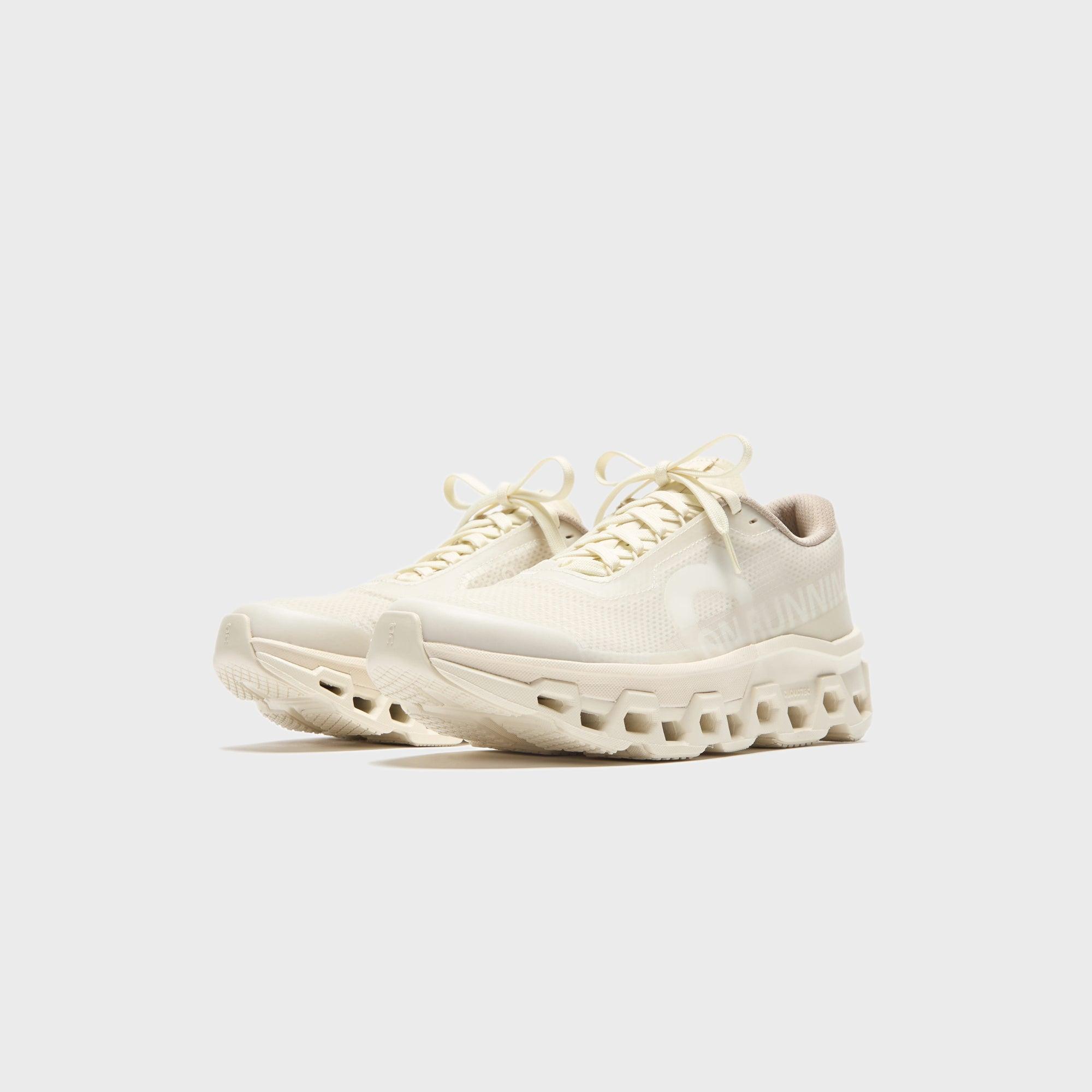 On Running x INVINCIBLE Cloudmonster 2 silhouette Mesh upper Padded collar Rubberized toecap Reinforced eyelets Branded tongue On Running branding at lateral sides Flat laces ON branding at heel Segmented Cloudtec rubber outsole Style: or3me30491195 Color: Ivory / Cream Material: Mesh
