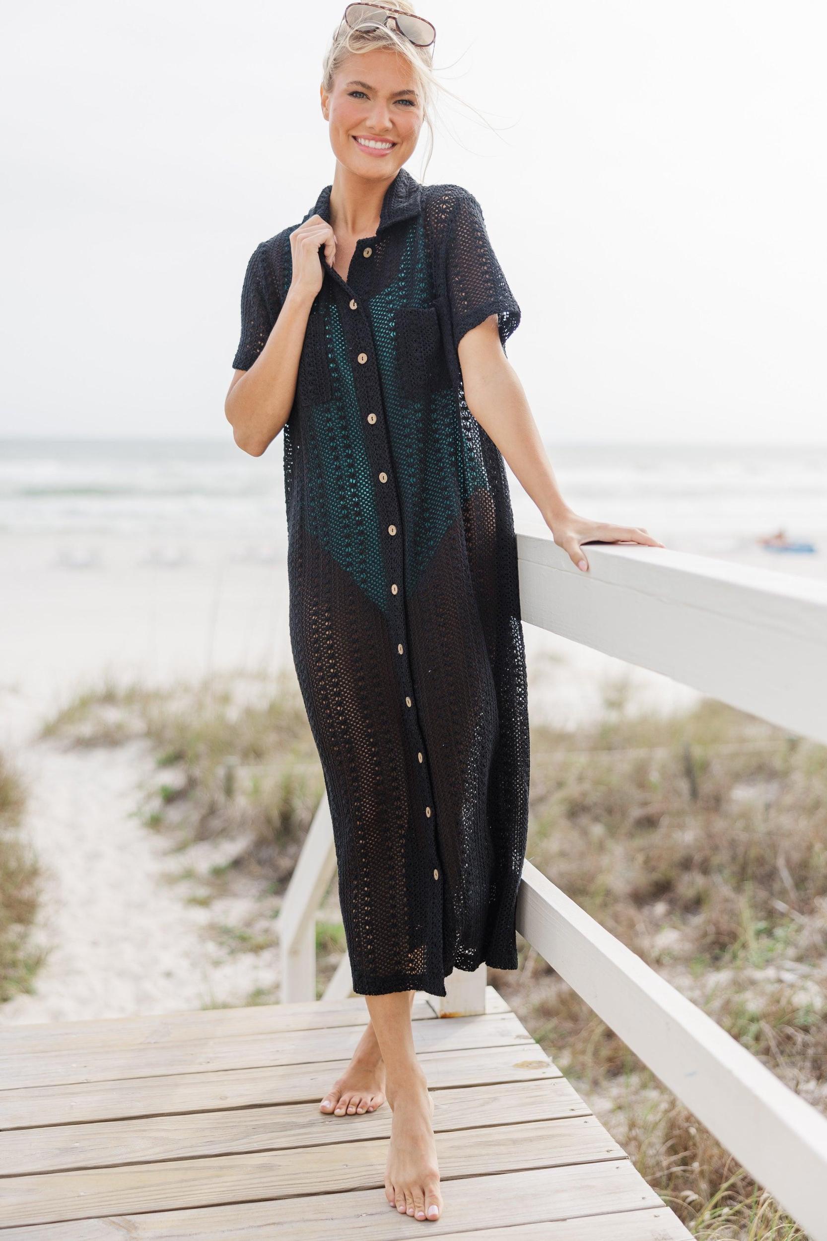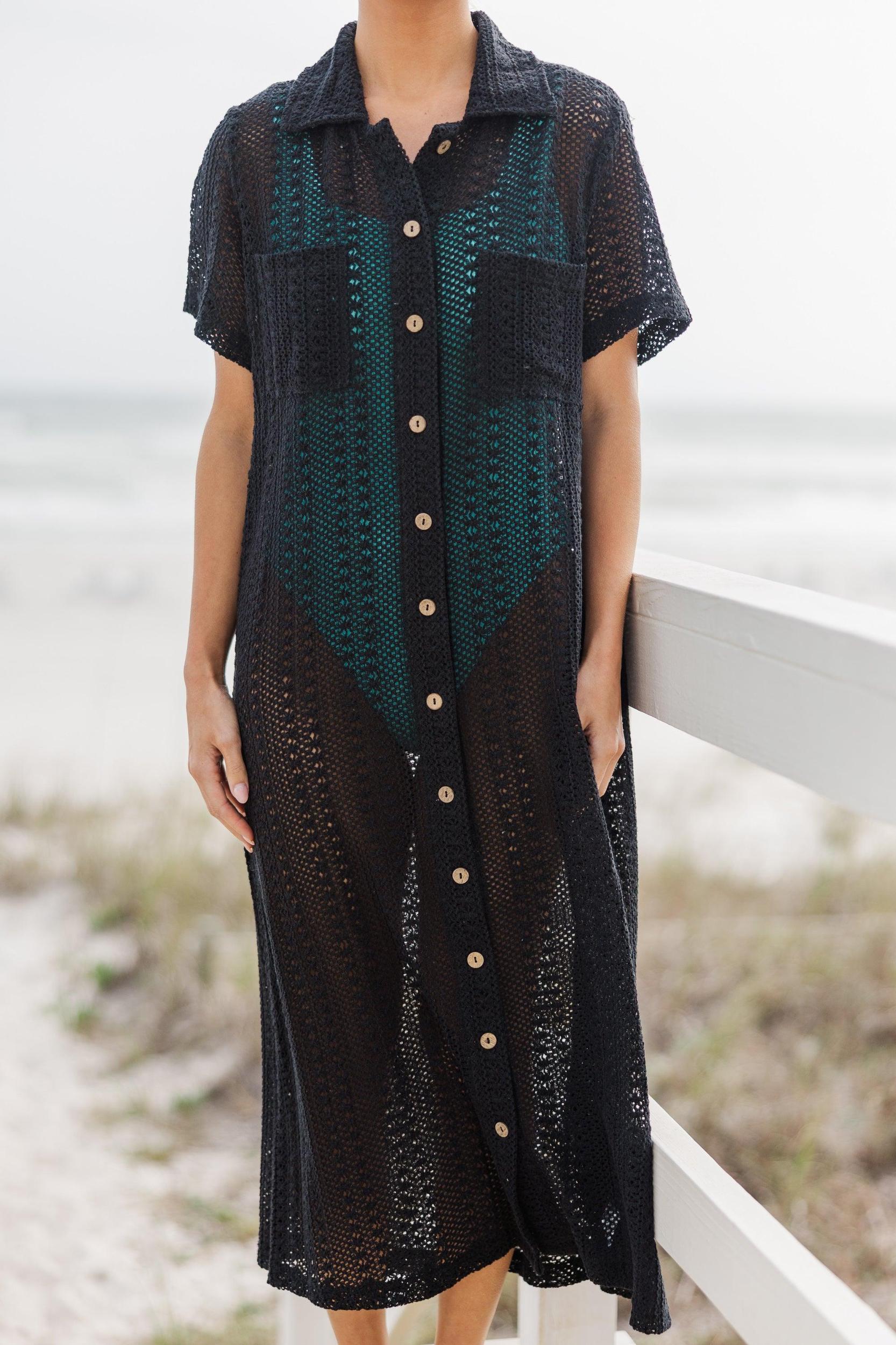 This sheer crochet cover up is just so chic! That button down fit is so chic and we love the length! This button down cover up is a summer dream come true! Collared neckline Button down front closure Short sleeves Crochet sheer fabric Fair stretch Baileigh is wearing the small.