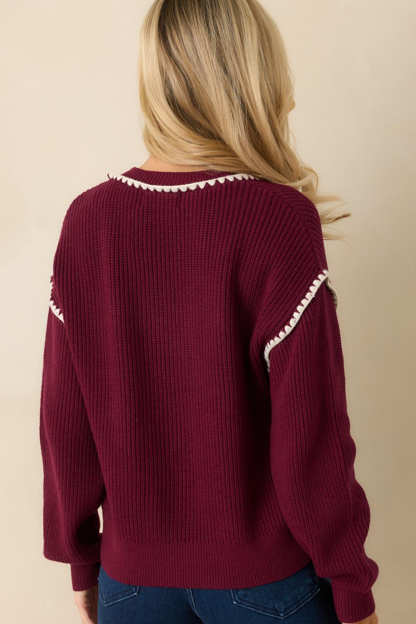The On The Mark Maroon Contrast Trim Knit Button Up Cardigan hits just right, a polished layer that adds instant confidence to your everyday style. This maroon cardigan features a functional button front, ribbed knit construction, v-neckline, long sleeves, and contrasting white whipstitch trim along the edges and sleeves. 51% Viscose, 28% Polyester, & 21% NylonContrast: 45% Acrylic, 29% Polyester, & 26% Nylon Unlined Hand Wash Cold Manufactured in China Designed in The USA Model is 5'6" and Wearing a Size Small