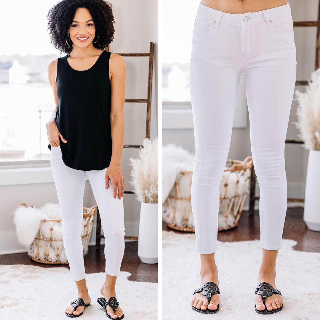These are fabulous jeans for being on the road, or for going to brunch, or for anything you could possibly think of! They are the perfect classic skinnies for the spring and summer seasons! These jeans feature a skinny, tapered leg, front and back pockets, button and zip front closure, and a clean hem. Material has a fair amount of stretch. Leanora is wearing the size 3.