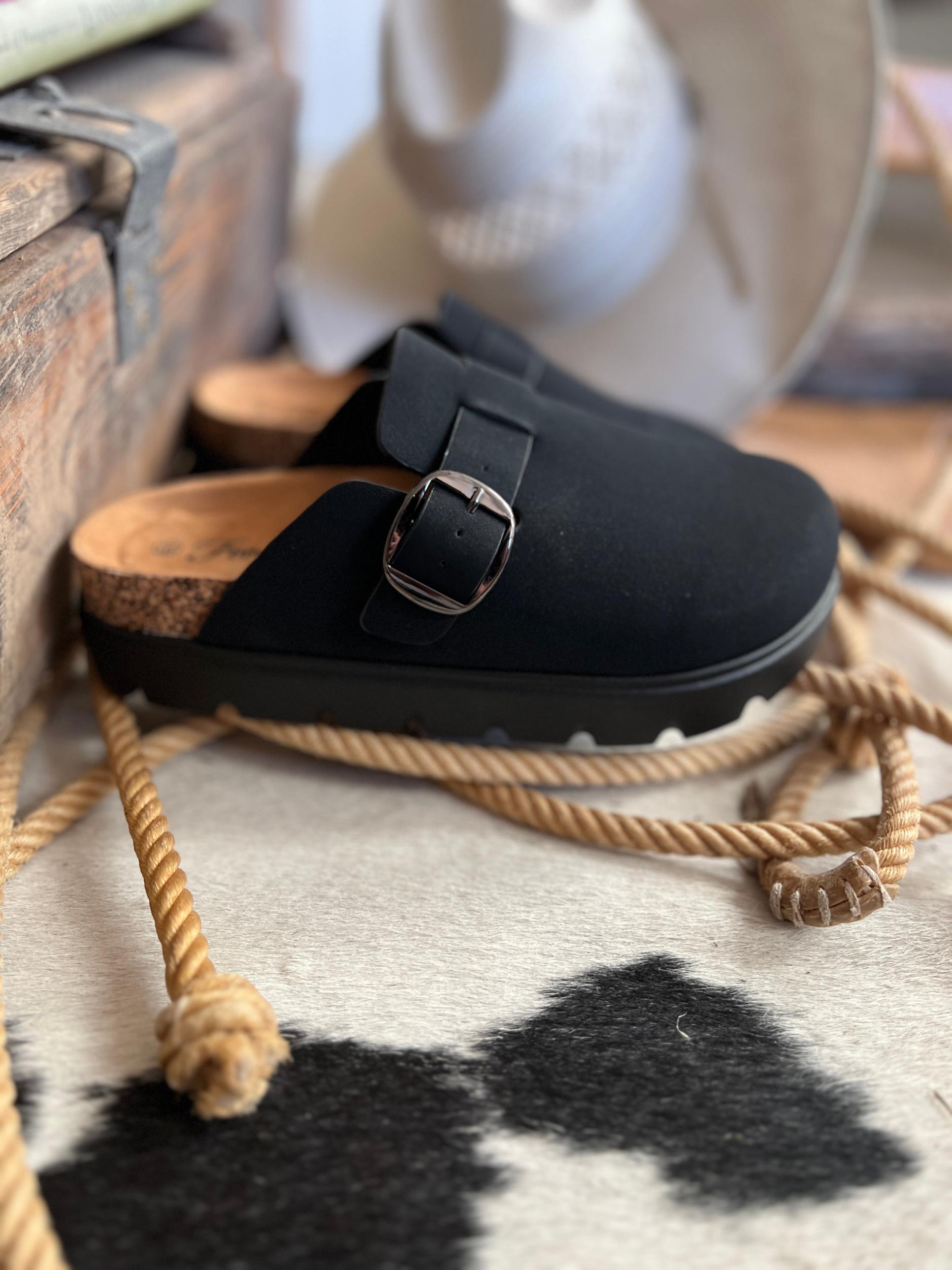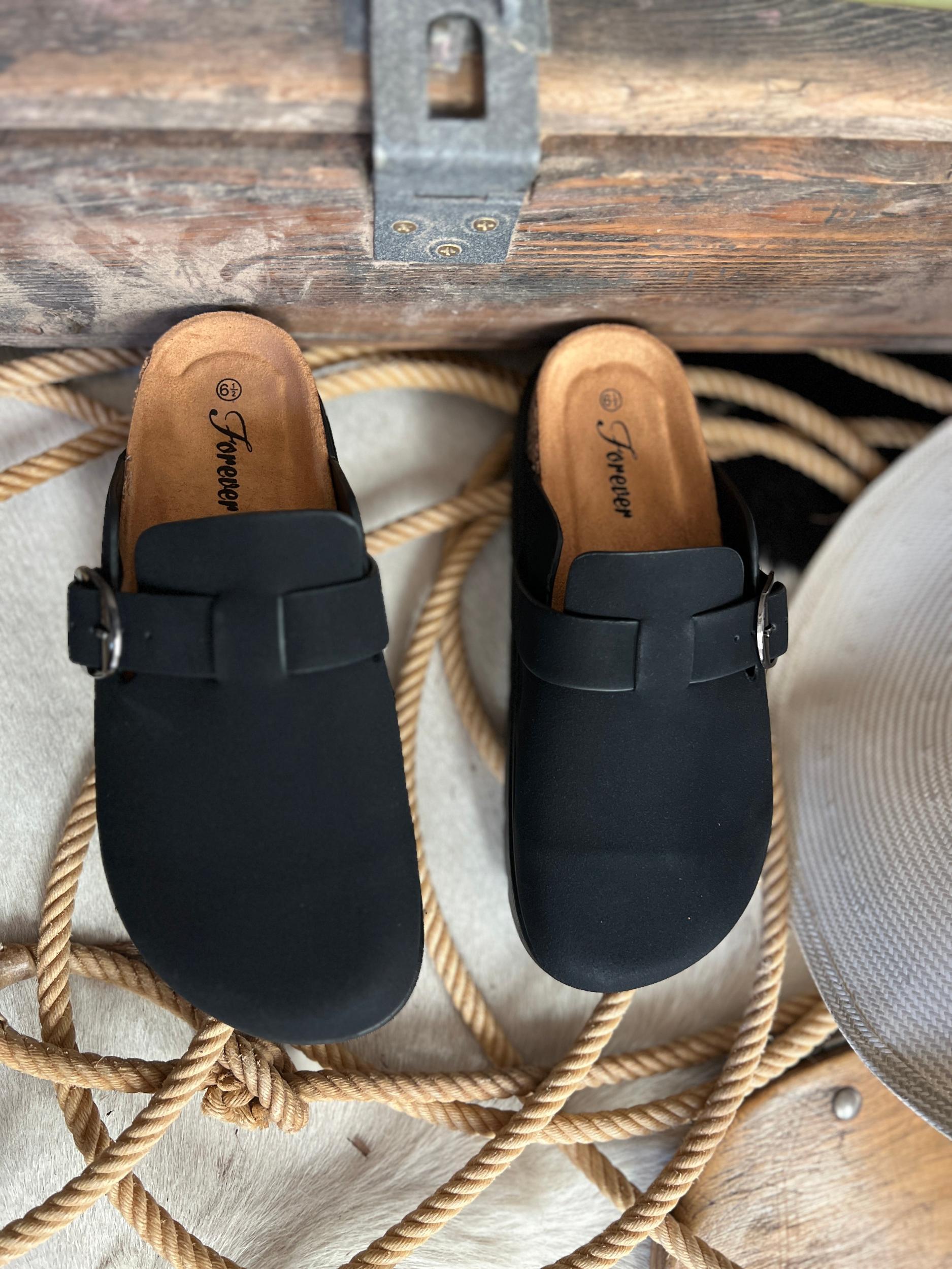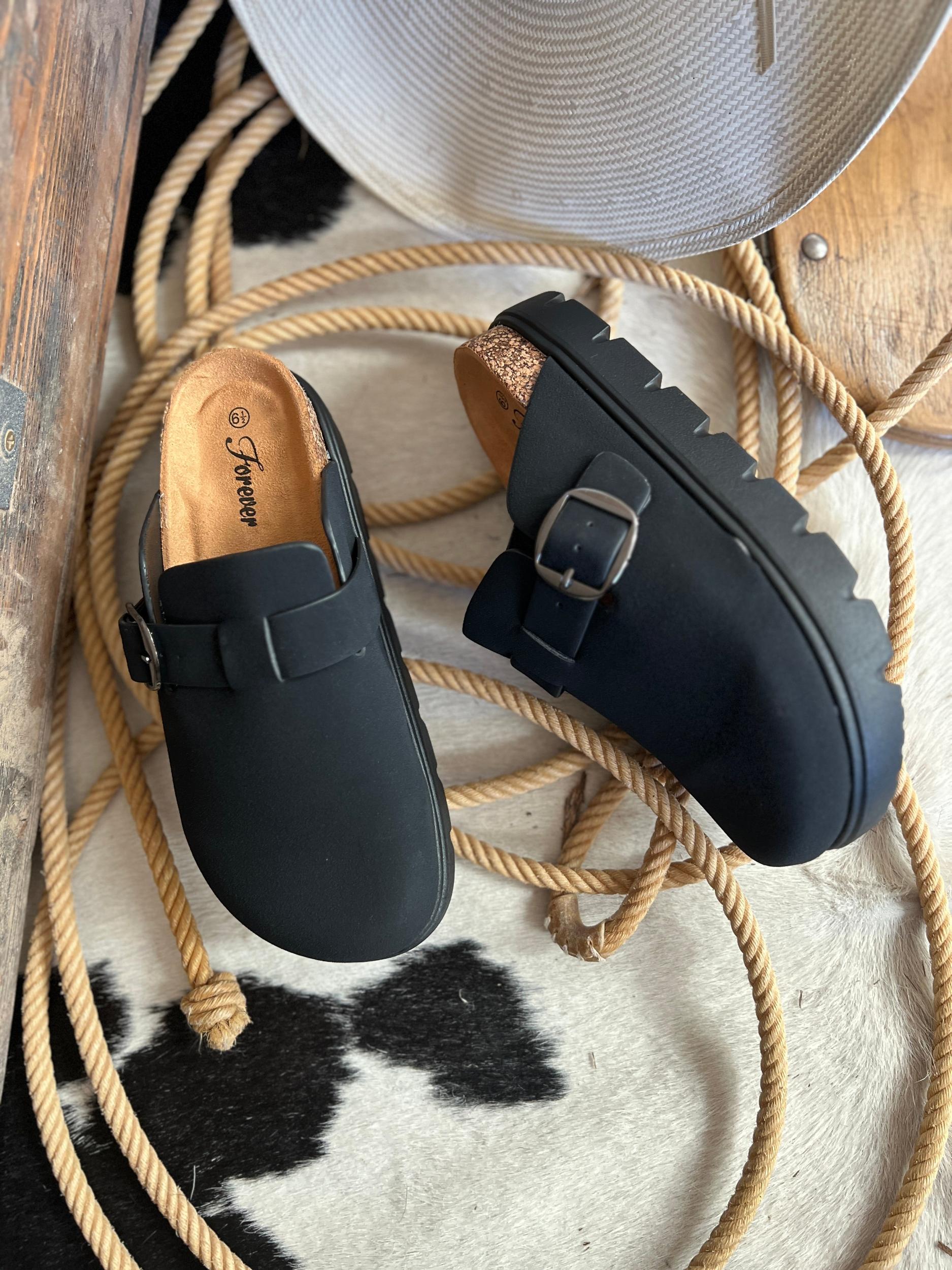 On Top Of The World Clogs- Black | Gussied Up Online Boutique Step up your style with our On Top Of The World Clogs- Black! These sleek black platform clogs feature a side buckle and cushioned footbed for all-day comfort. The rubber sole provides traction while the solid black color and trending fashion make a stylish statement. Elevate your look today! True to size.