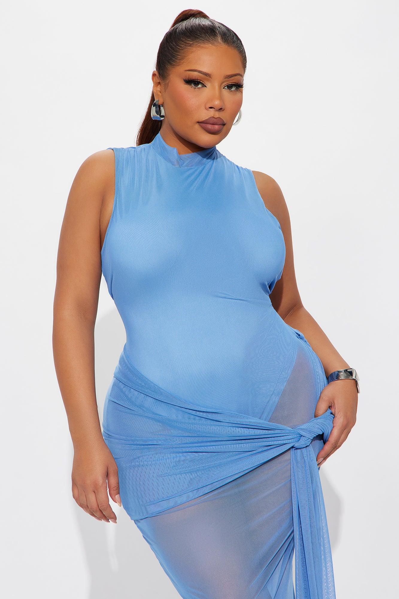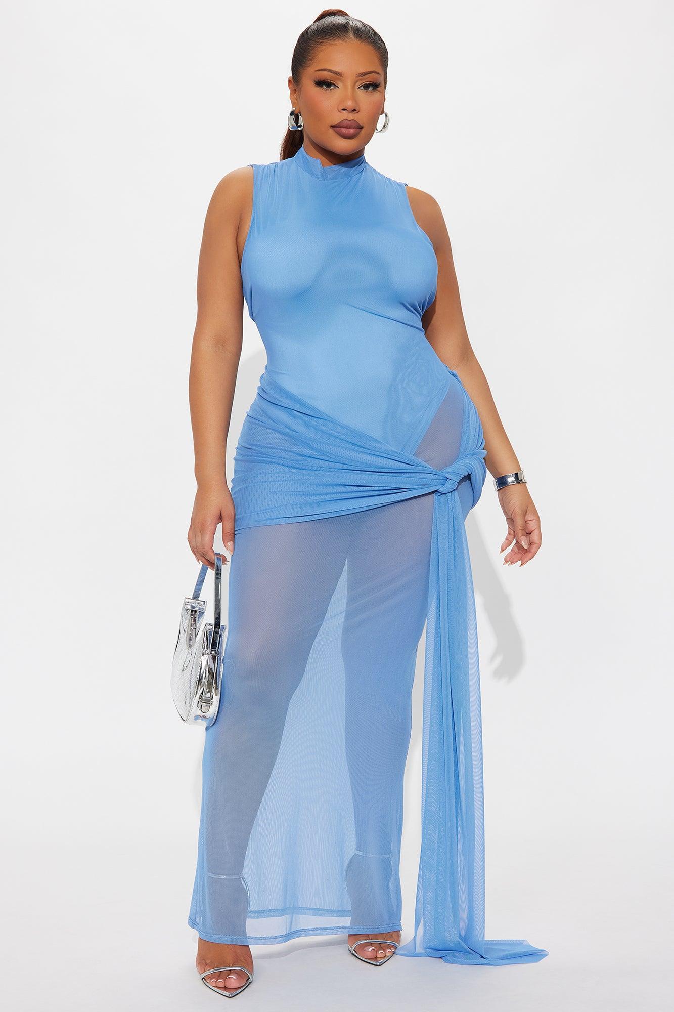 Available In Blue, Magenta And Red. Mesh Maxi Dress Mock Neck Sleeveless Tie Waist Sheer Bodysuit Lining Snap Button Closure Stretch Final Sale Self: 95% Polyester 5% Spandex Contrast: 100% Polyester Imported Imported California Proposition 65WARNING: Cancer and Reproductive Harm - www.P65Warnings.ca.gov.