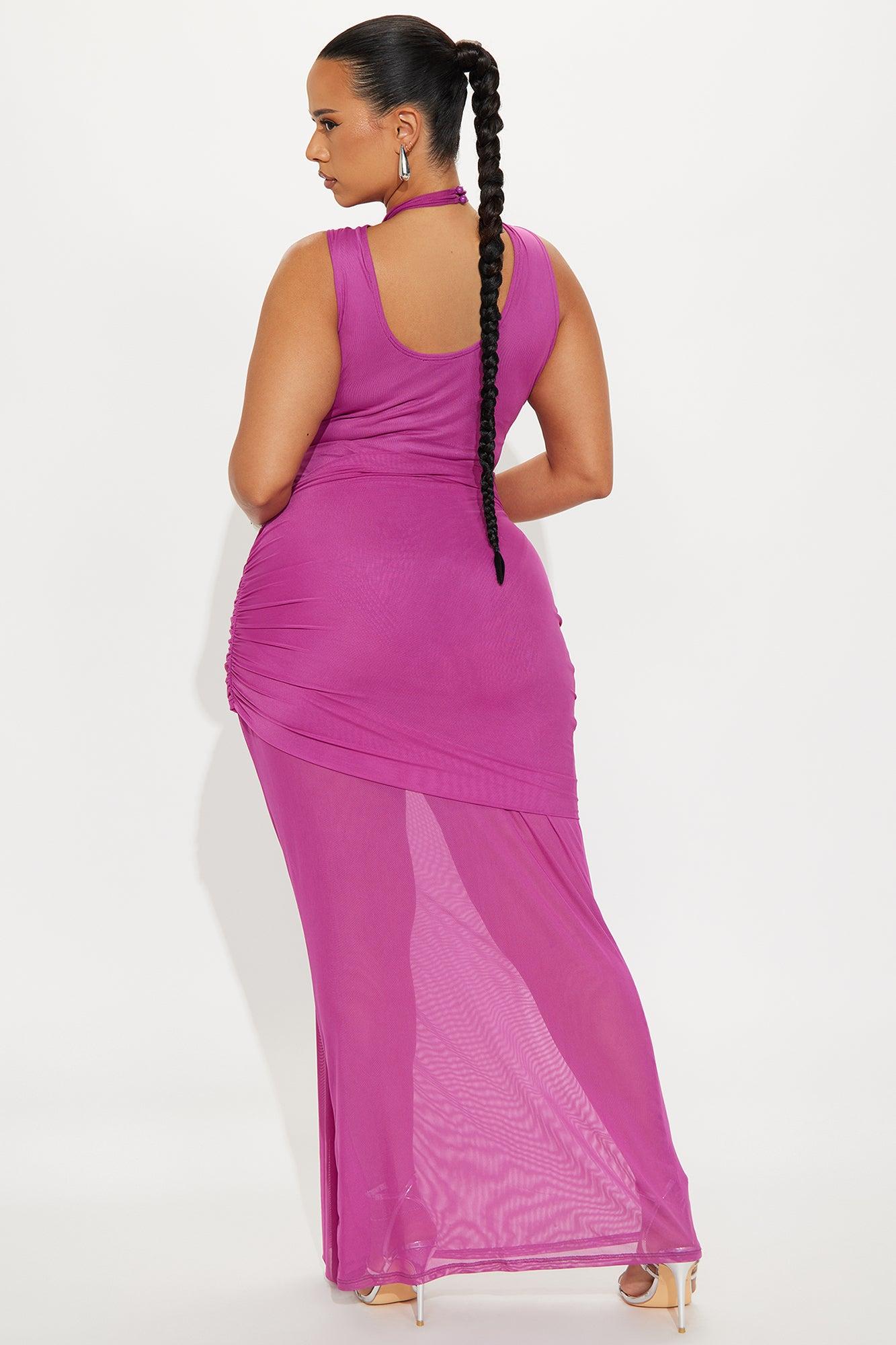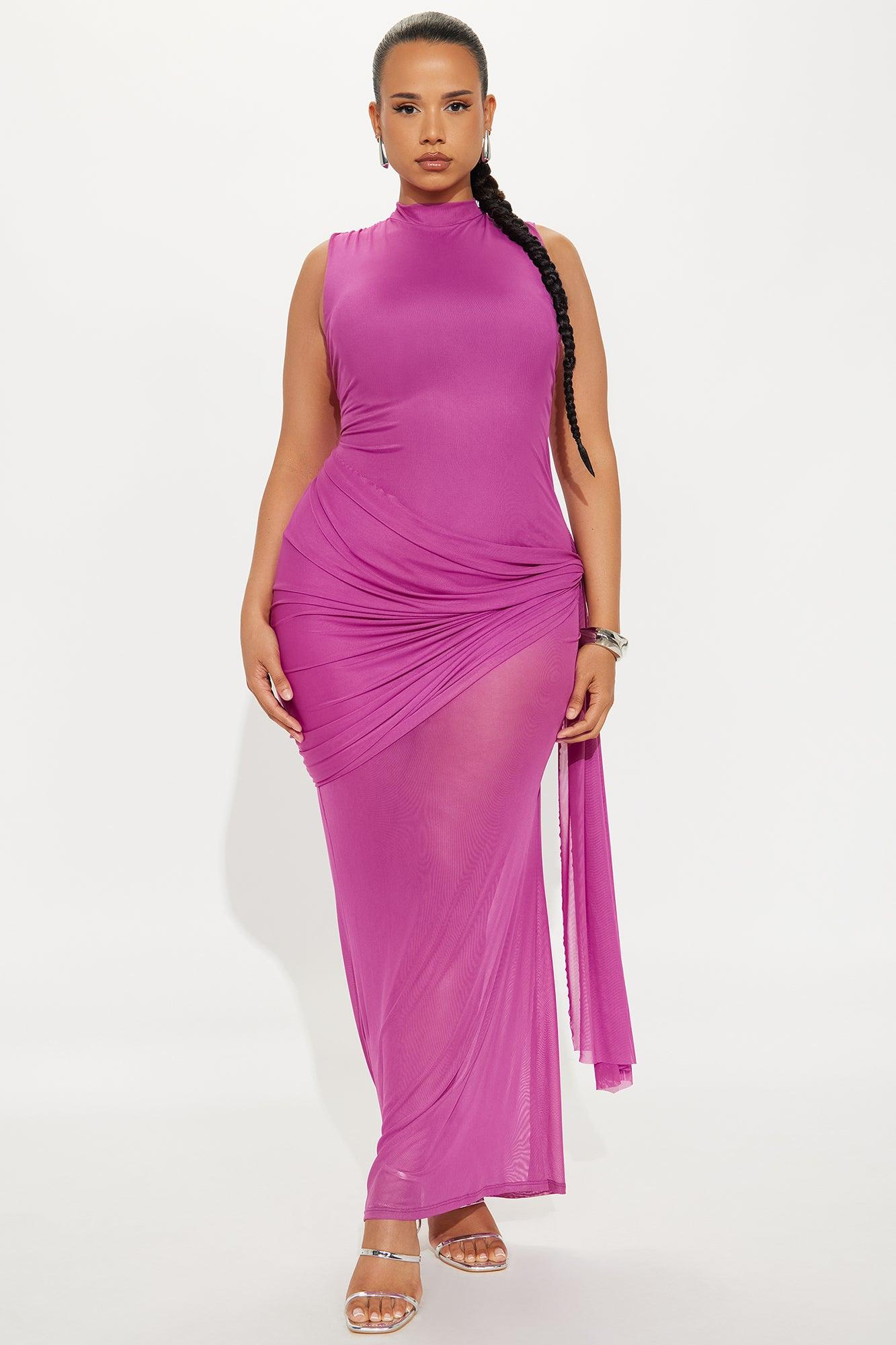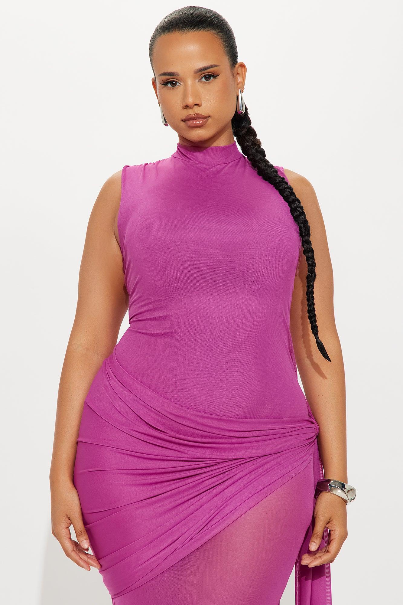 Available In Blue, Magenta And Red. Mesh Maxi Dress Mock Neck Sleeveless Tie Waist Sheer Bodysuit Lining Snap Button Closure Stretch Final Sale Self: 95% Polyester 5% Spandex Contrast: 95% Polyester 5% Spandex Imported California Proposition 65WARNING: Cancer and Reproductive Harm - www.P65Warnings.ca.gov.