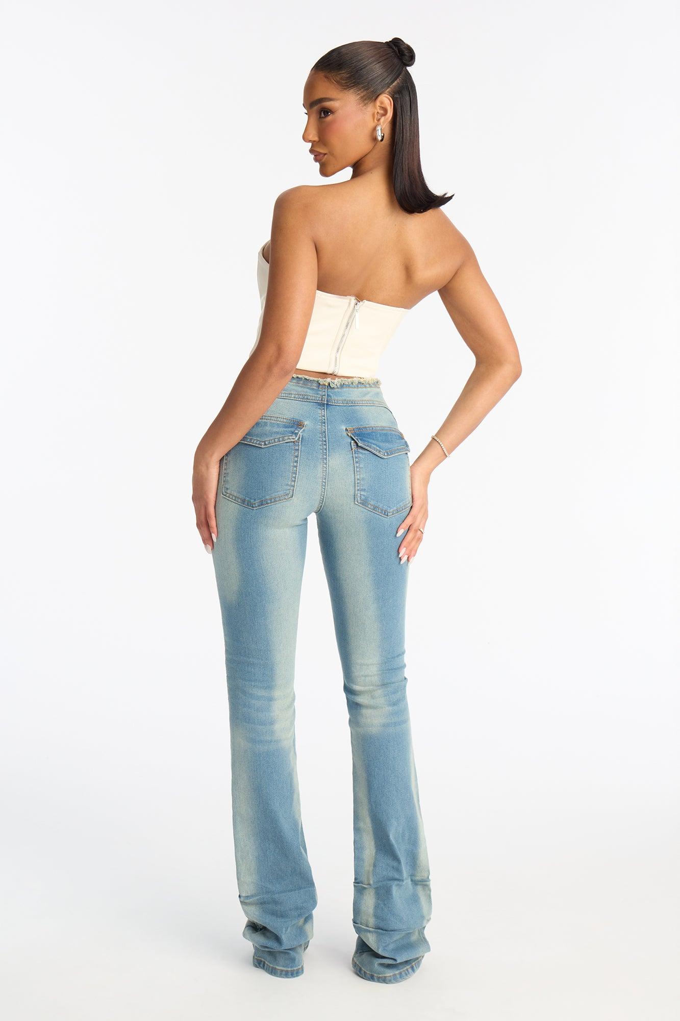 Available In Medium Blue Wash. Bootcut Jean 5 Pocket Cut Off Waistband 9" Rise 36" Inseam Medium Stretch Disclaimer: To Keep The Aesthetic Of This Garment, Please Follow The Care Instructions Carefully. Self: 46% Cotton 36% Polyester 17% Rayon 1% Elastane Imported California Proposition 65WARNING: Cancer and Reproductive Harm - www.P65Warnings.ca.gov.