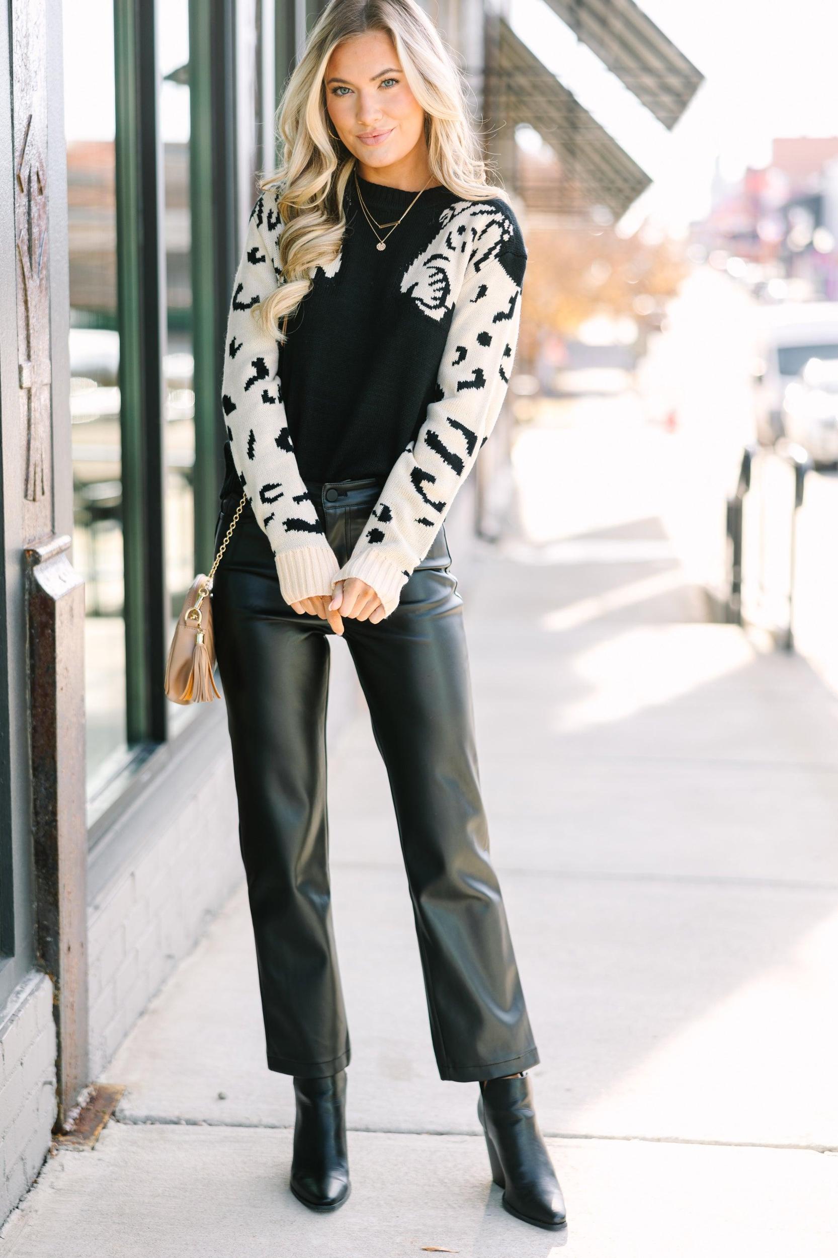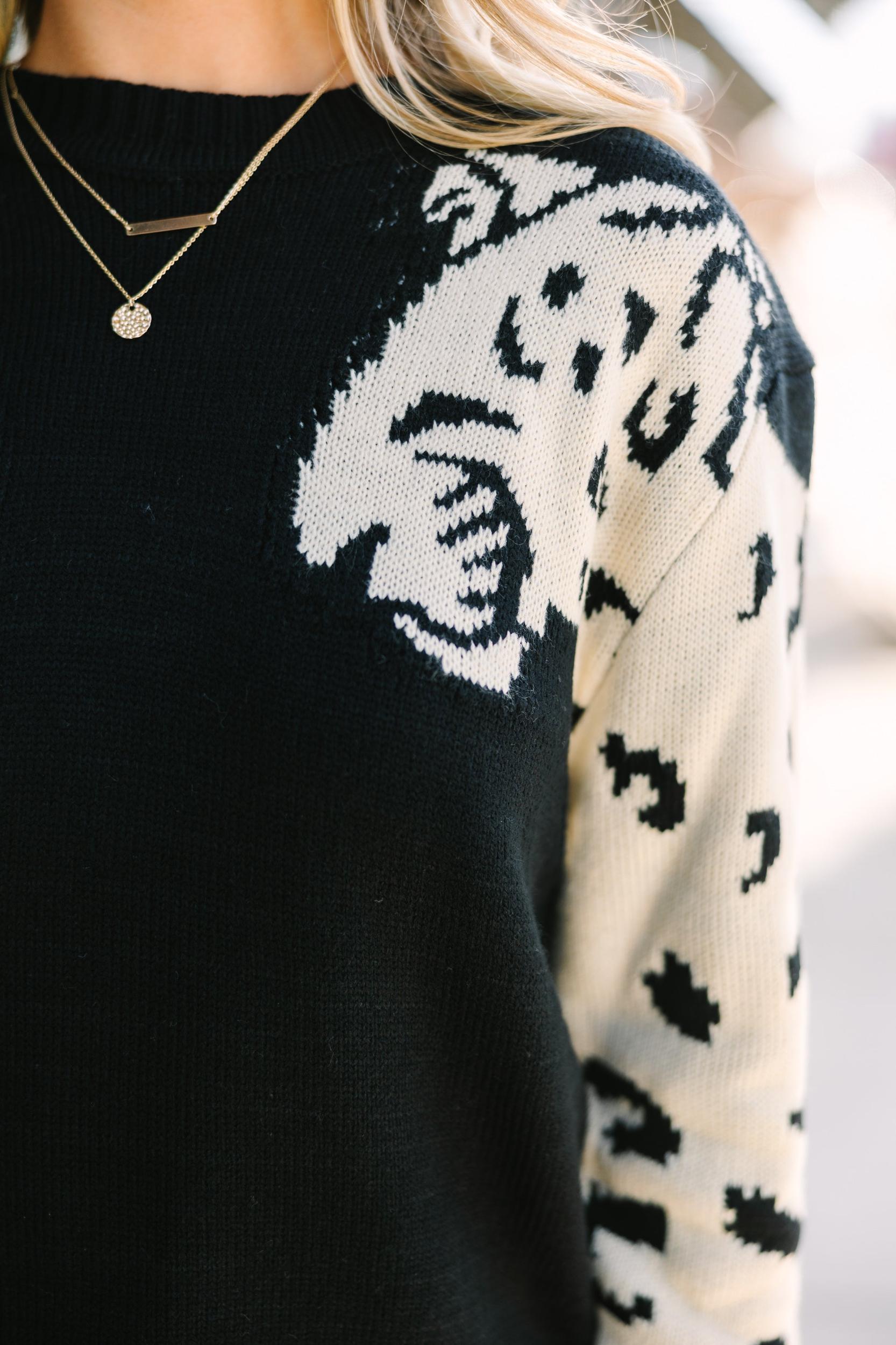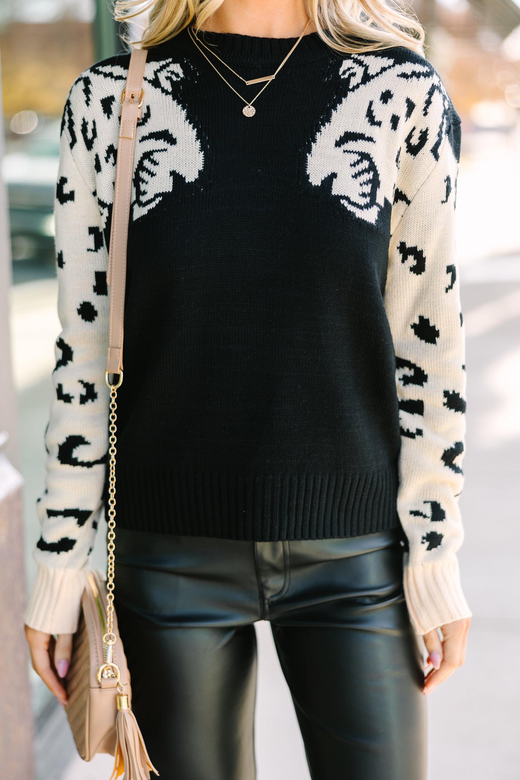 This sweater is so sassy and fun! We love dueling cats! The neutral coloring is also very chic. This sweater will look great with dark to medium wash jeans or faux leather pants. Round neckline Long sleeves Cheetahs down ear arm Generous stretch Baileigh is wearing the small.