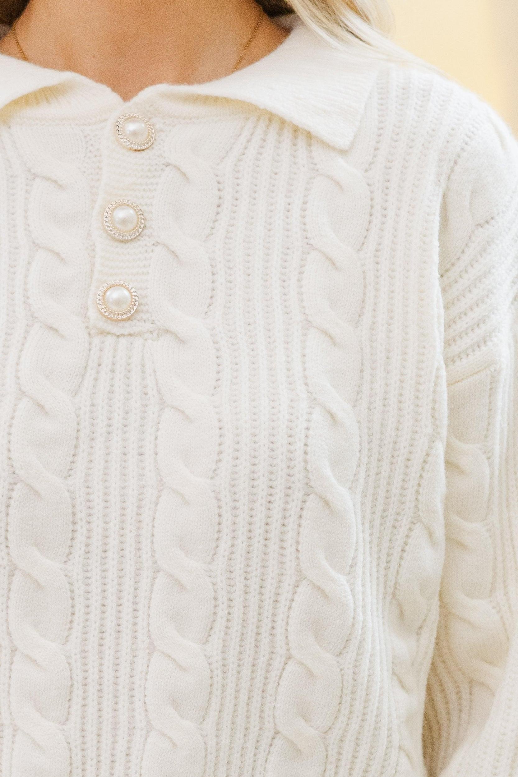 Embrace timeless elegance with our solid cream cable knit sweater, designed to add a touch of sophistication to your wardrobe. This cozy piece features a classic cable knit pattern that offers both texture and warmth, making it a perfect choice for chilly days. The charming collar adds a refined detail, while the pearl button accents elevate the overall look, giving this sweater a chic and polished finish. Collared partial button down neckline Long bubble sleeves Cable knit fabric Generous stretch Baileigh is wearing the small.