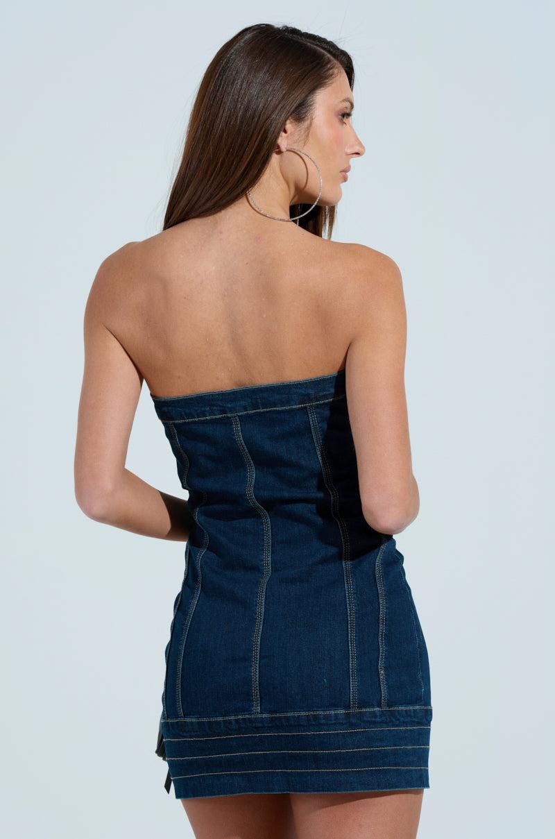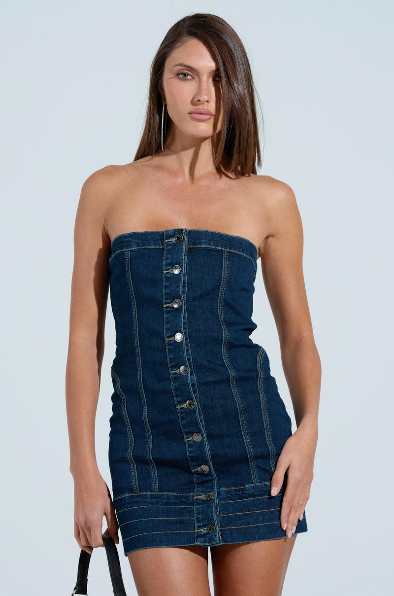 You got something special in The AKIRA Label One Of A Kind Denim Mini Dress. This cute style is crafted from a cotton blend denim base and features a dark wash colorway, a paneled construction, a strapless neckline, contrast stitching, and metallic button down closures running down the center. Complete with a mini length and a bodycon silhouette. Pair with a cropped fur bolero, platform pumps, and chunky jewelry for a finished look. - 66% Cotton 29% Polyester 3% Viscose 2% Spandex- Slightly Stretchy- Imported (all measurements approximate from size small)- 23.5” Chest to Hem- Model is 5’9” and is wearing size smallProduct ID: 1024718 (all measurements approximate from size 1X)- 26.5” Chest to HemProduct ID: 1024722