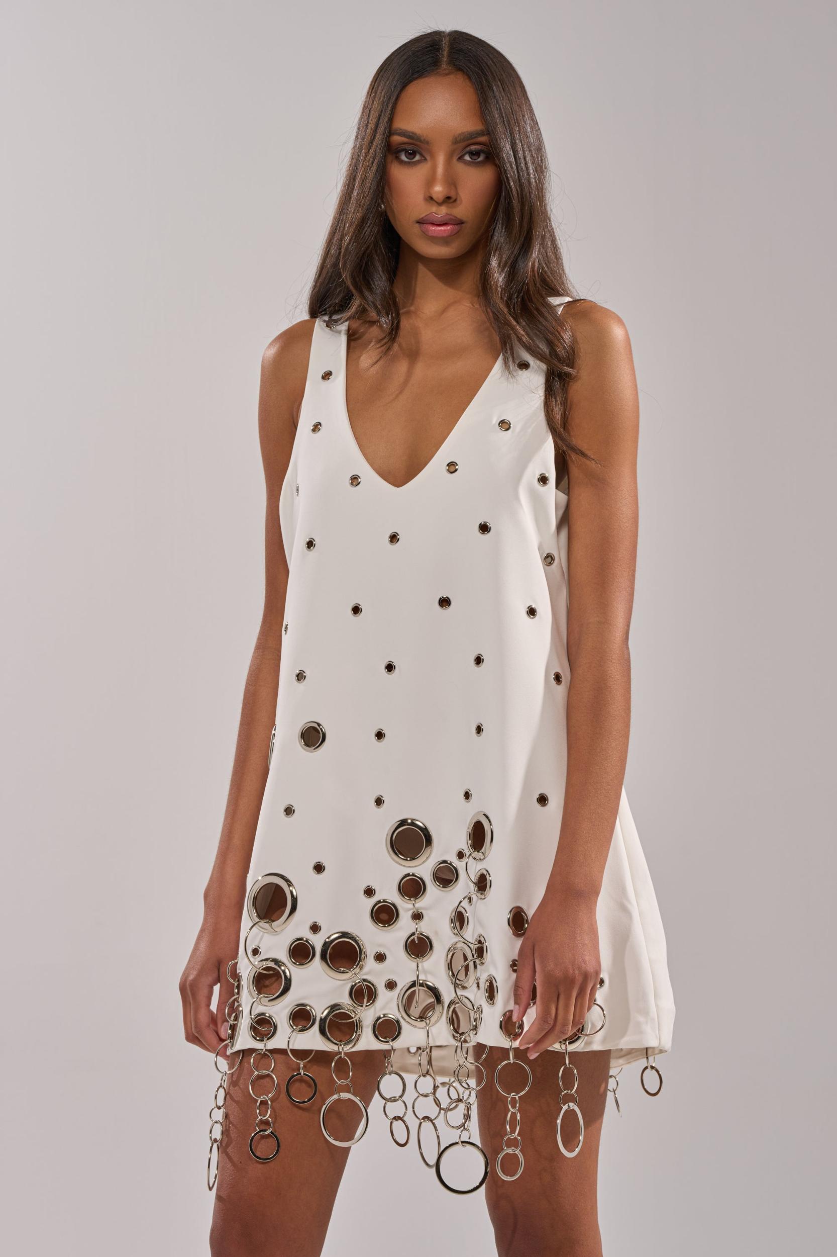 This embellished white mini dress is crafted from a smooth, structured fabric and features a flattering V-neckline, wide shoulder straps, and allover silver-tone grommet embellishments that cascade into dramatic chain fringe along the hem for a bold, high-impact look. Finished with a sleek slip-on silhouette for easy wear. Dress it up with strappy heels and a mini bag for a night out, or style with chunky boots and a leather jacket for an edgy, IG-ready ensemble. - Shell: 95% Polyester 5% Spandex, Lining: 92% Polyester 8% Spandex- Slight Stretch- Imported (all measurements approximate from size small)- 31.5” Shoulder to Hem- 11” Shoulder to Shoulder- Model is 5’10” and is wearing size smallProduct ID: 1078592 (all measurements approximate from size 1X)- 34.5” Shoulder to Hem- 14” Shoulder to ShoulderProduct ID: 1078596
