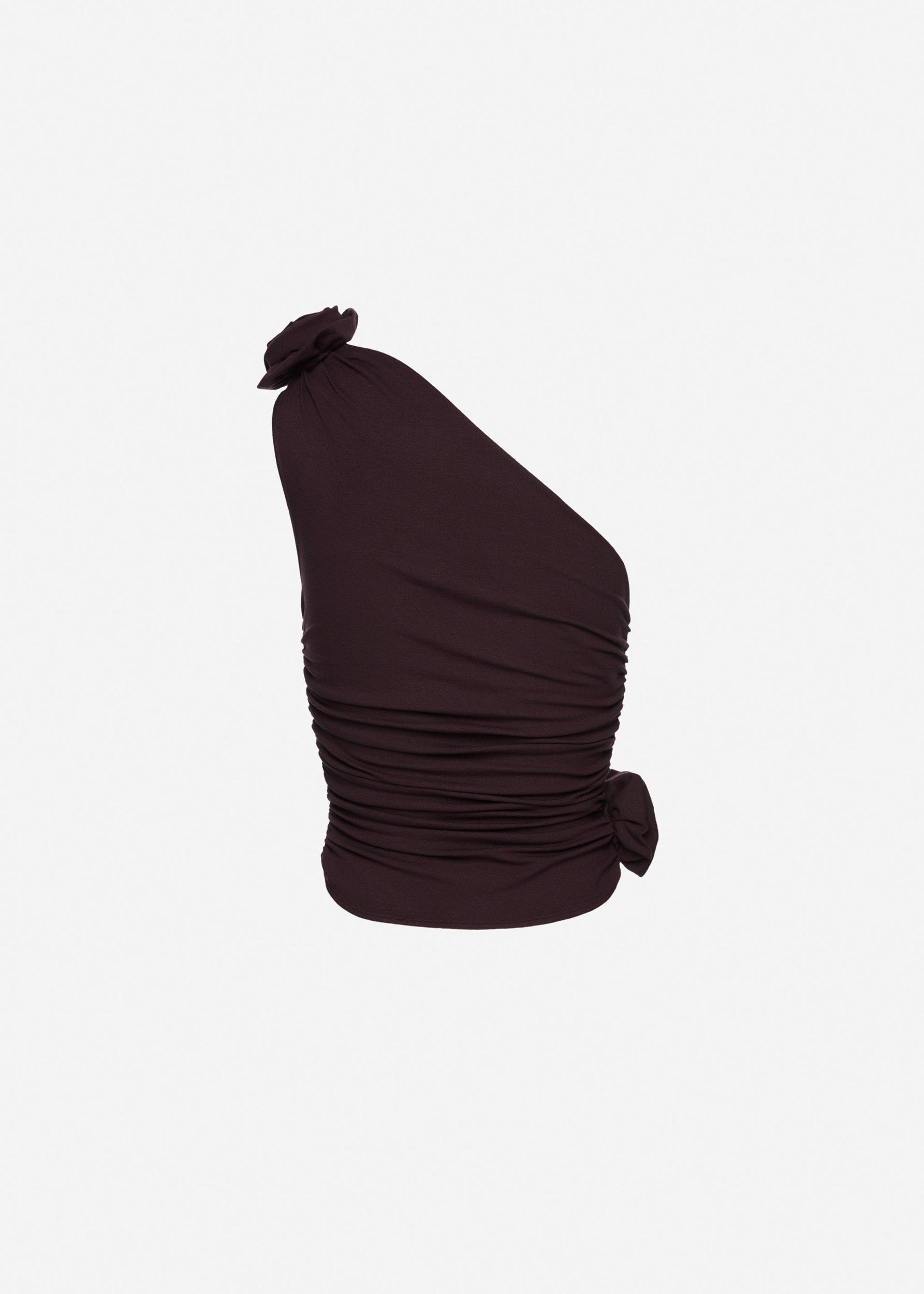 Magda reinvisions the classic t-shirt in a totally modern way: a lightweight one-shoulder asymmetrical top with ruched detailing and 3D cotton roses.
