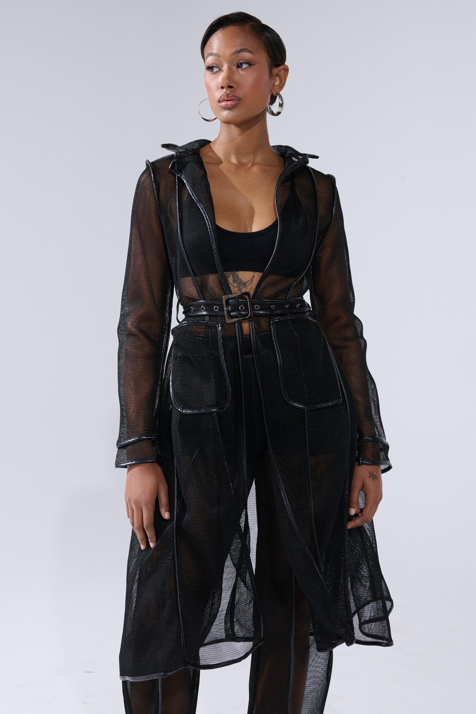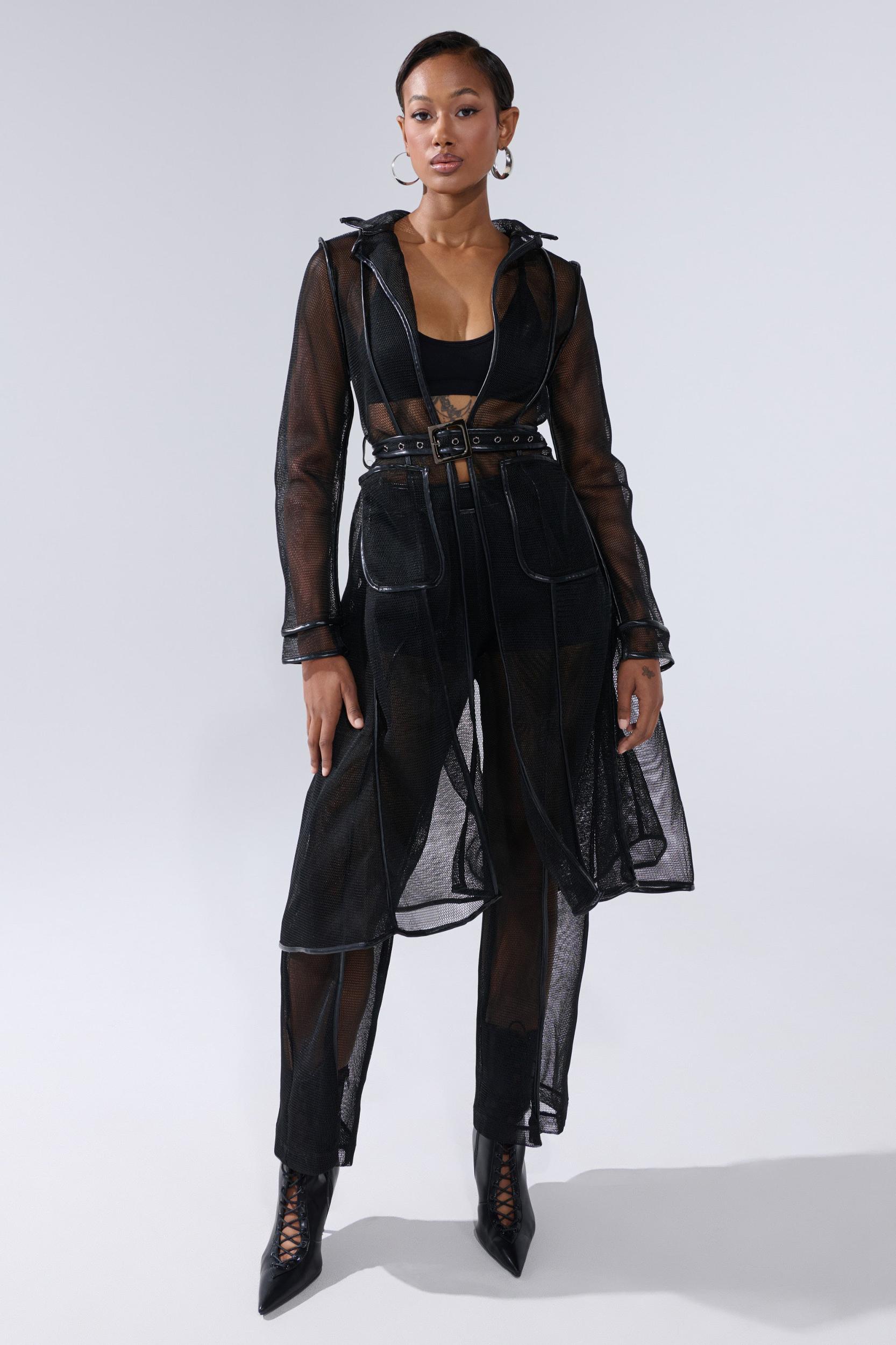 The AKIRA Label One To Watch Mesh Trench In Black is crafted from unlined, sheer fishnet mesh and features tonal faux leather trim detailing, a standing collar, long sleeves, a coordinating adjustable buckled waist belt, dual roomy side pockets, and an open-front. Complete with a longline, A-line silhouette. Style it with a corset, the coordinating AKIRA Label One To Watch Mesh Trouser, stiletto booties, and a red lip for a finished look. - Shell 1: 100% Polyester, Shell 2: 50% PU 50% Polyester- Little Stretch- Imported (all measurements approximate from small)- 44” Shoulder to Hem- 14” Shoulder to Shoulder- 25” SleevesProduct ID: 1062957 (all measurements approximate from 1X)- 46” Shoulder to Hem- 16” Shoulder to Shoulder- 27” SleevesProduct ID: 1062961