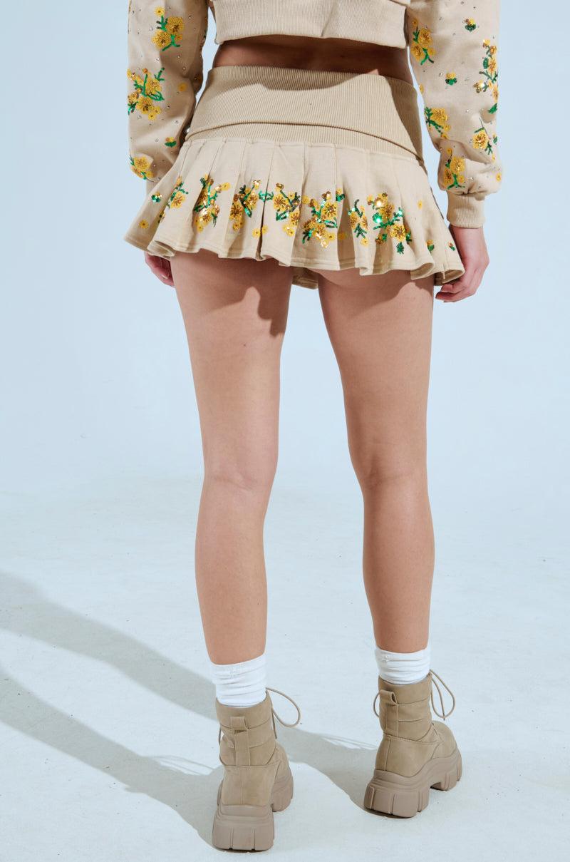 The AKIRA Label One Too Many Times Ruffle Micro Mini Skirt will never get old. This sassy style is crafted from a stretchy cotton blend base and features a fold over ribbed knit waistband, a pleated ruffled construction, mock front flap pocket detailing, and a floral design made of sequins scattered throughout. Complete with an ultra-mini length, a flared silhouette, and an easy, pull-on fit. Pair with the matching AKIRA Label One Too Many Times Zip Up Sweatshirt and chunky sneakers for a finished look. - Main: 72% Cotton 28% Polyester, Trim: 55% Polyester 45% Cotton- Spot Clean Only- Stretchy- Imported (all measurements approximate from size small)- 11” Waist to Hem- Model is 5’9” and is wearing size smallProduct ID: 437921 (all measurements approximate from size 1X)- 13” Waist to HemProduct ID: 437925