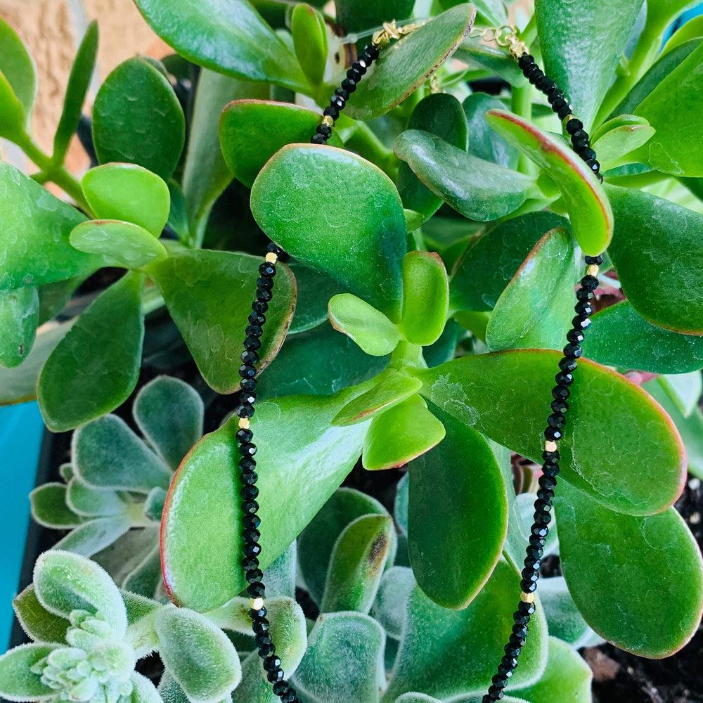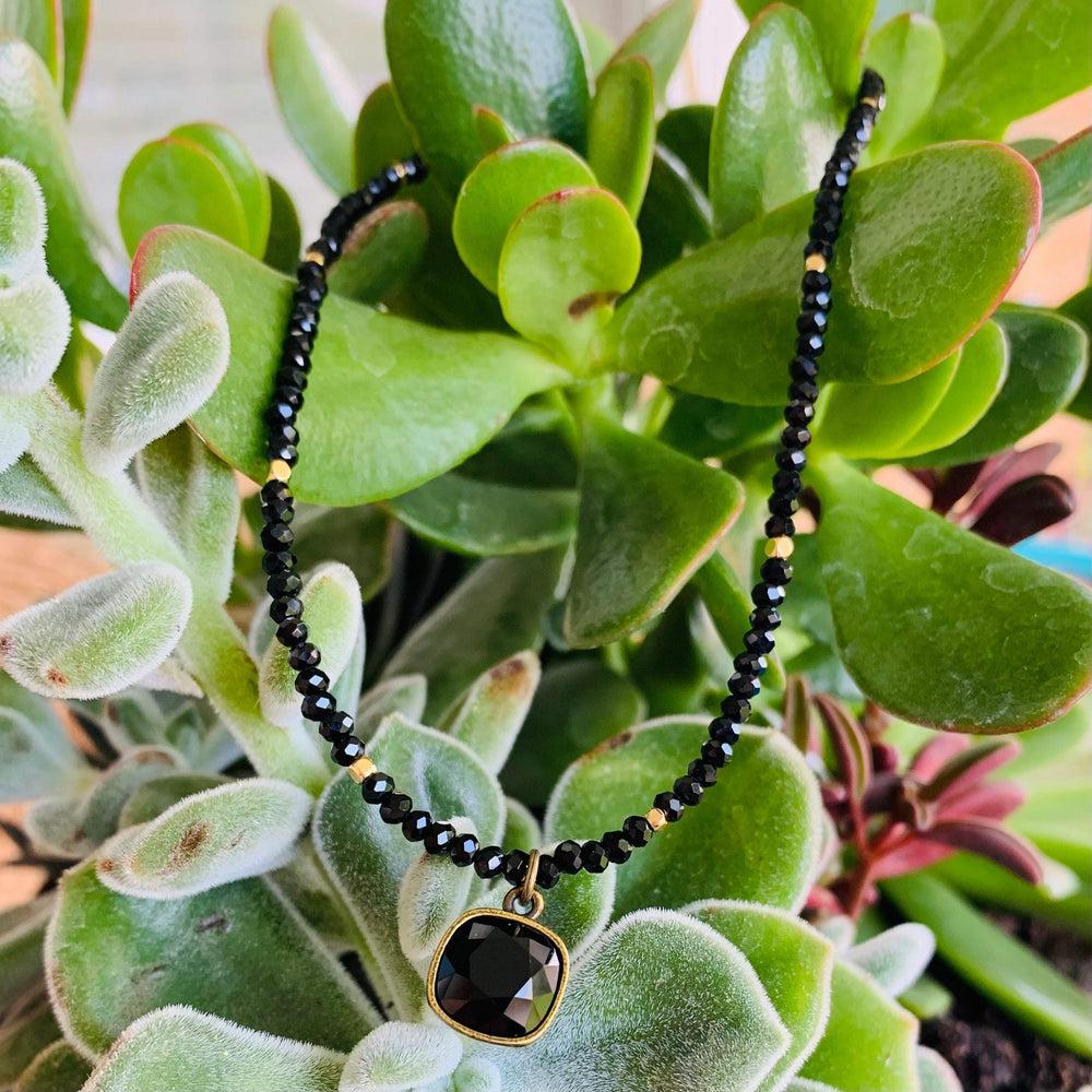 Black seed beads accented with gold and a cushion cut black crystal pendant. 14"