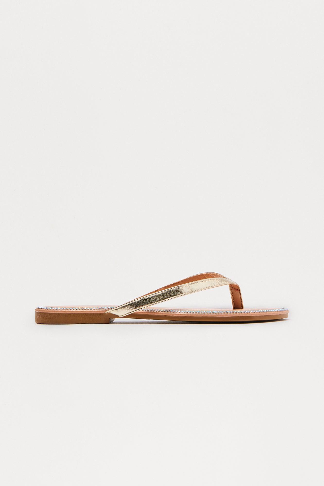 Available In Gold And Silver. Flat Sandals Flip Flops Rhinestone Trim Round Toe Flat Heel Imported California Proposition 65WARNING: Cancer and Reproductive Harm - www.P65Warnings.ca.gov.