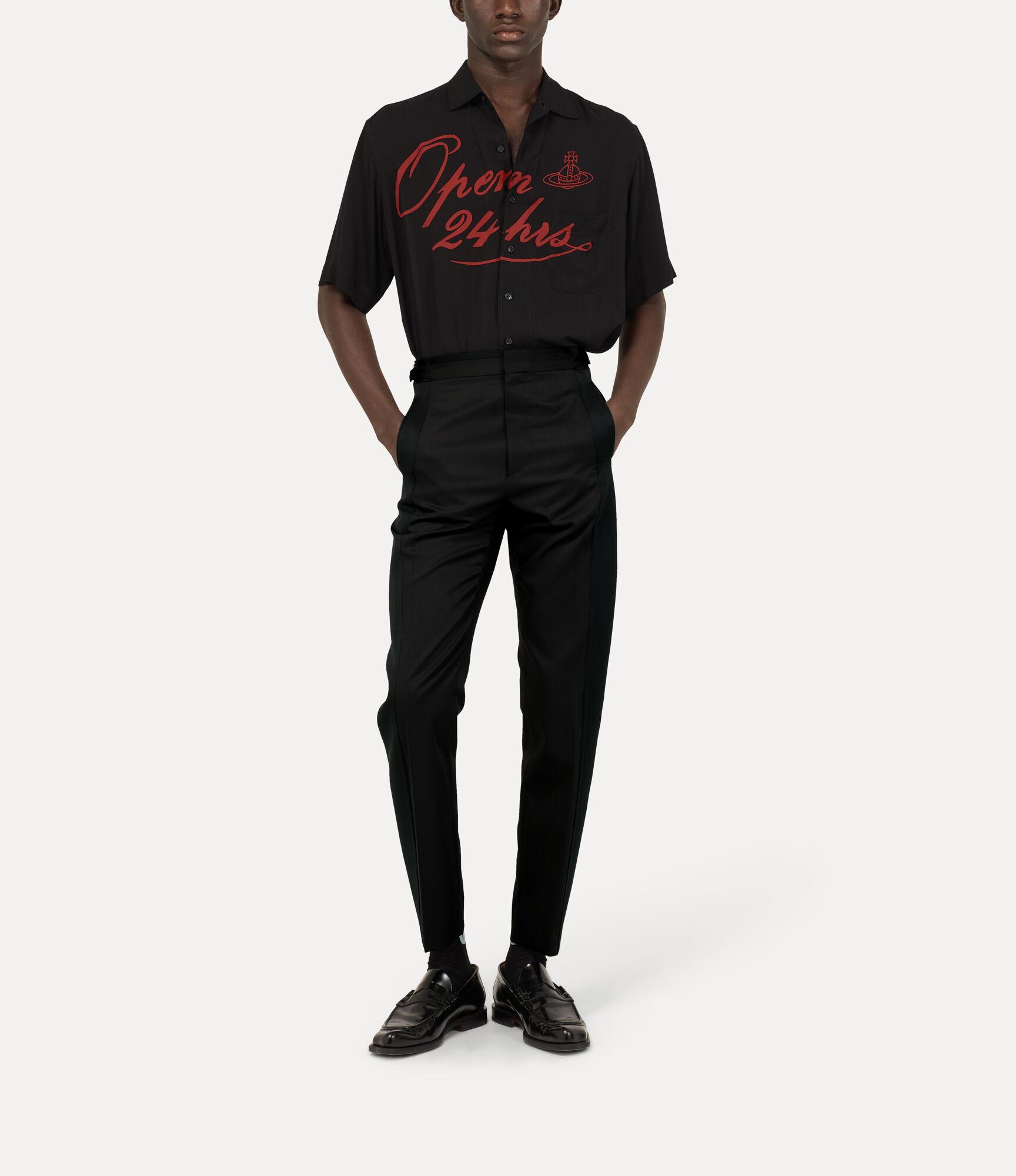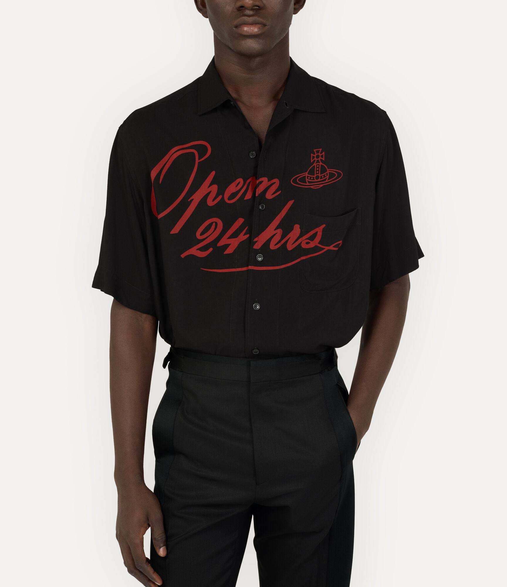 Our Bowling shirt is reimagined with the archival 'Open 24 Hrs' artwork in vivid red script, accompanied by the house’s signature orb motif. Designed with a classic flat collar, the piece is complete with a playful back graphic reading 'Back in 5 minutes'.