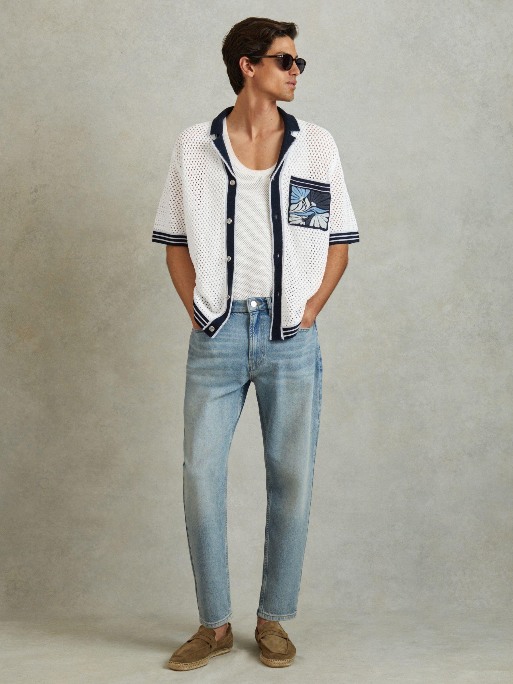 Open-Stitch Embroidered Cuban Collar Shirt in White/Blue