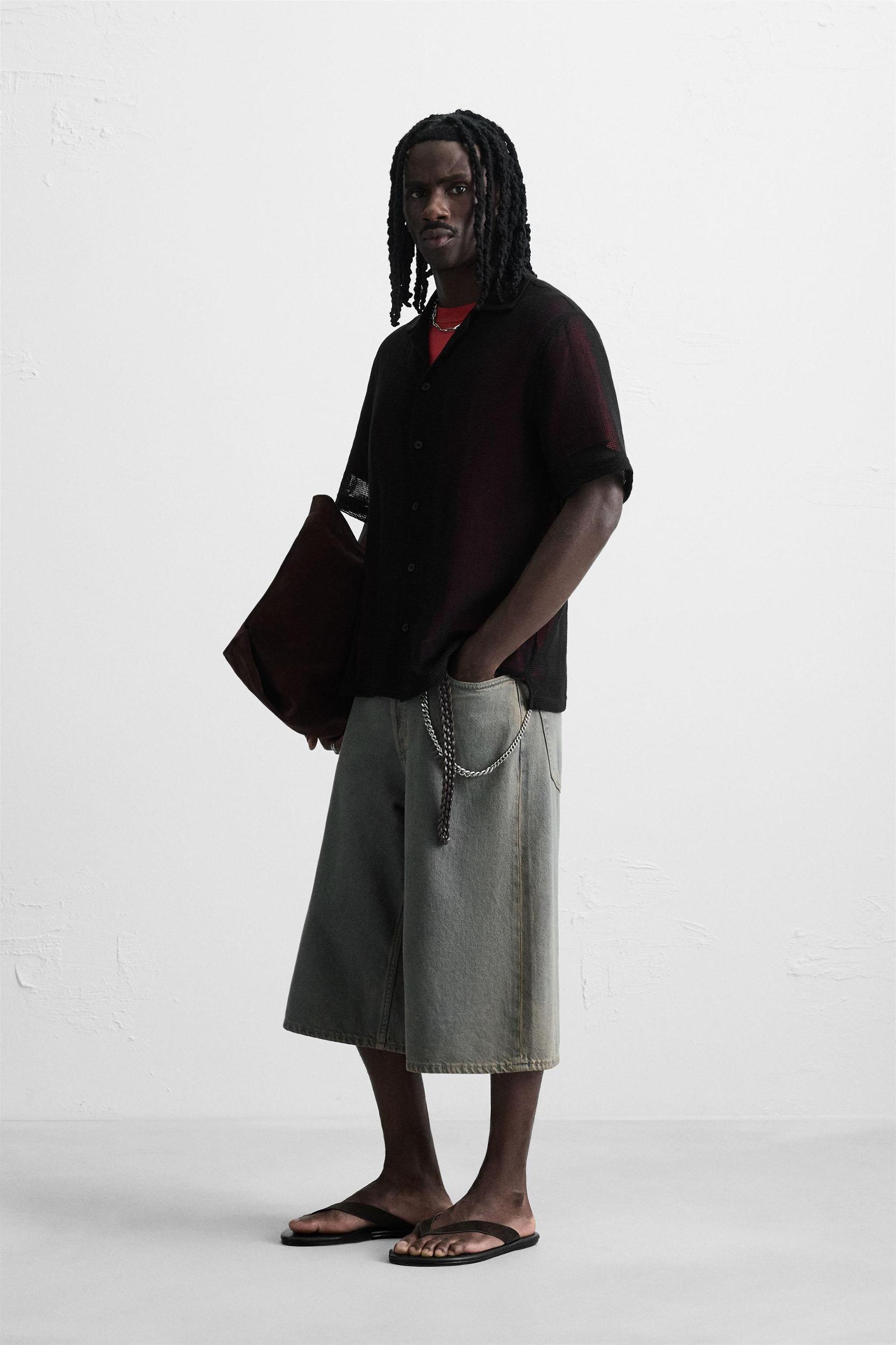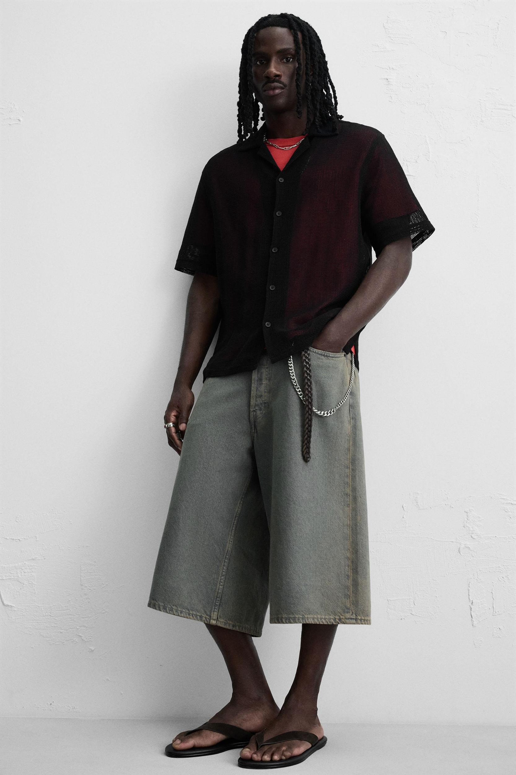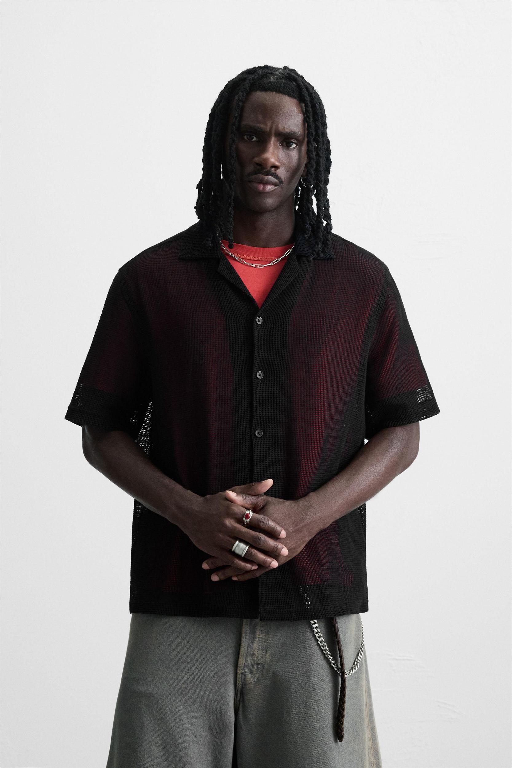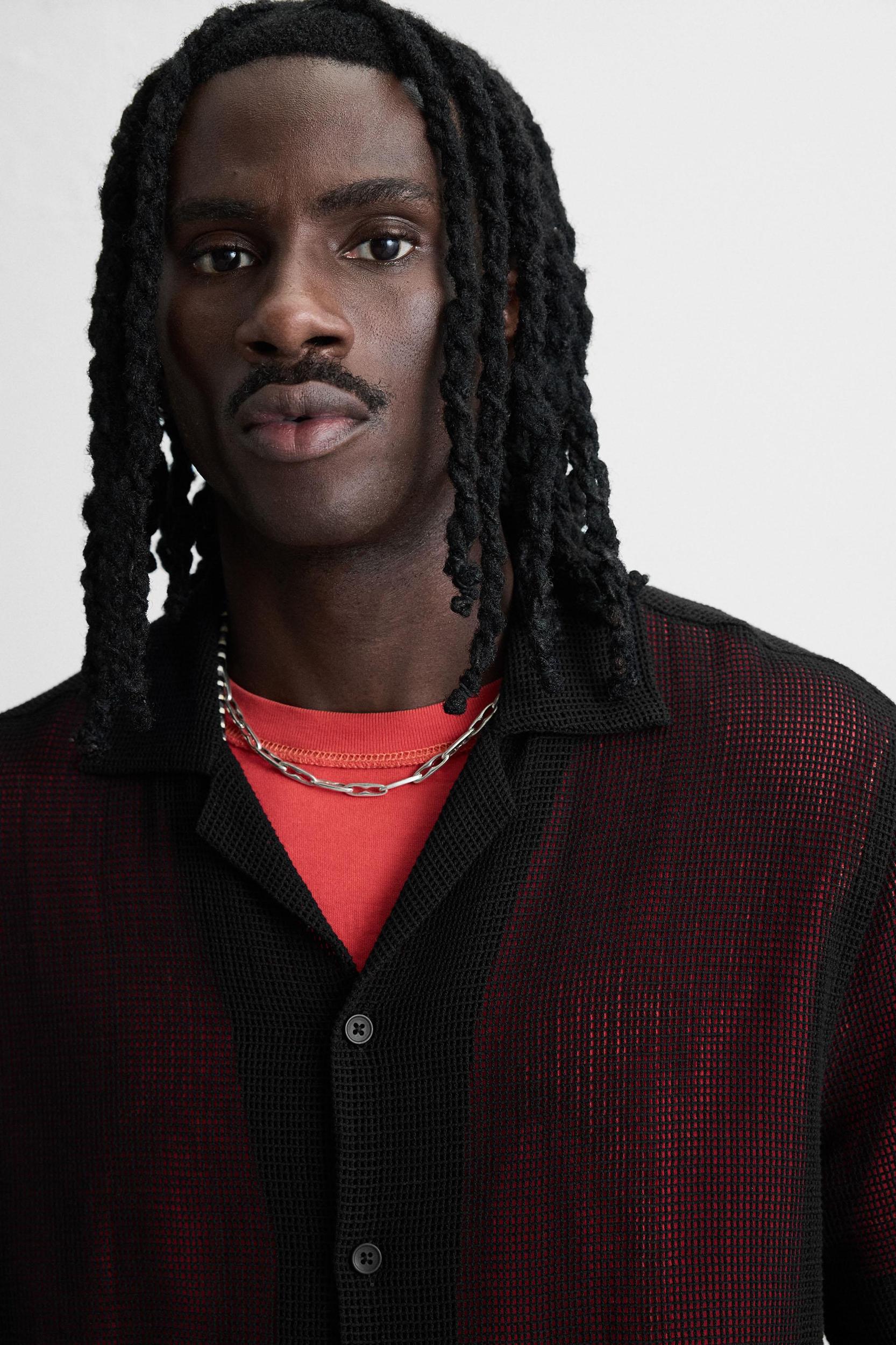 Relaxed fit shirt made of open weave fabric. Spread collar and short sleeves. Hem with side vents. Front button closure.