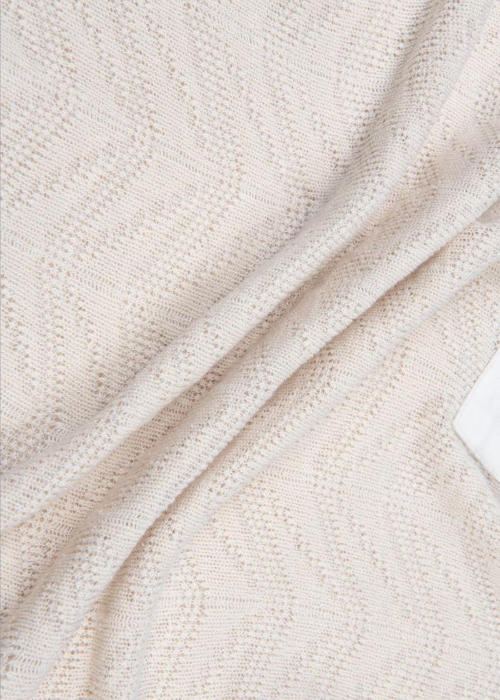 A subtle flex in a slightly sheer form. Crafted in an airy, open-weave knit with just enough texture to catch the light. This piece whispers luxury. It doesn't shout. Look closely and you’ll catch the intricate tonal patterning.