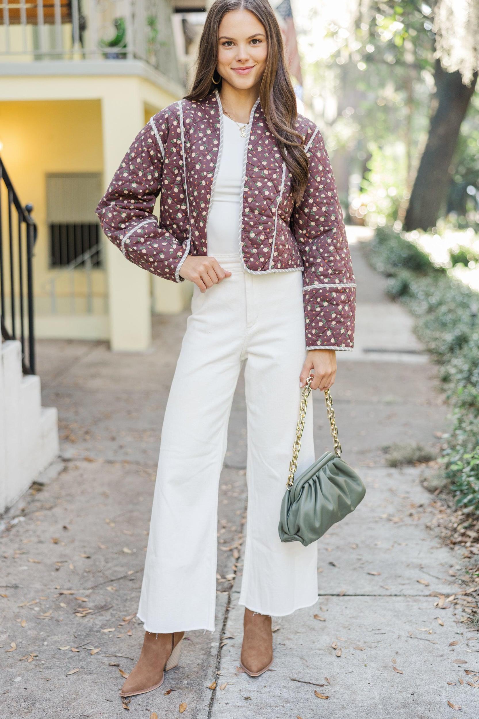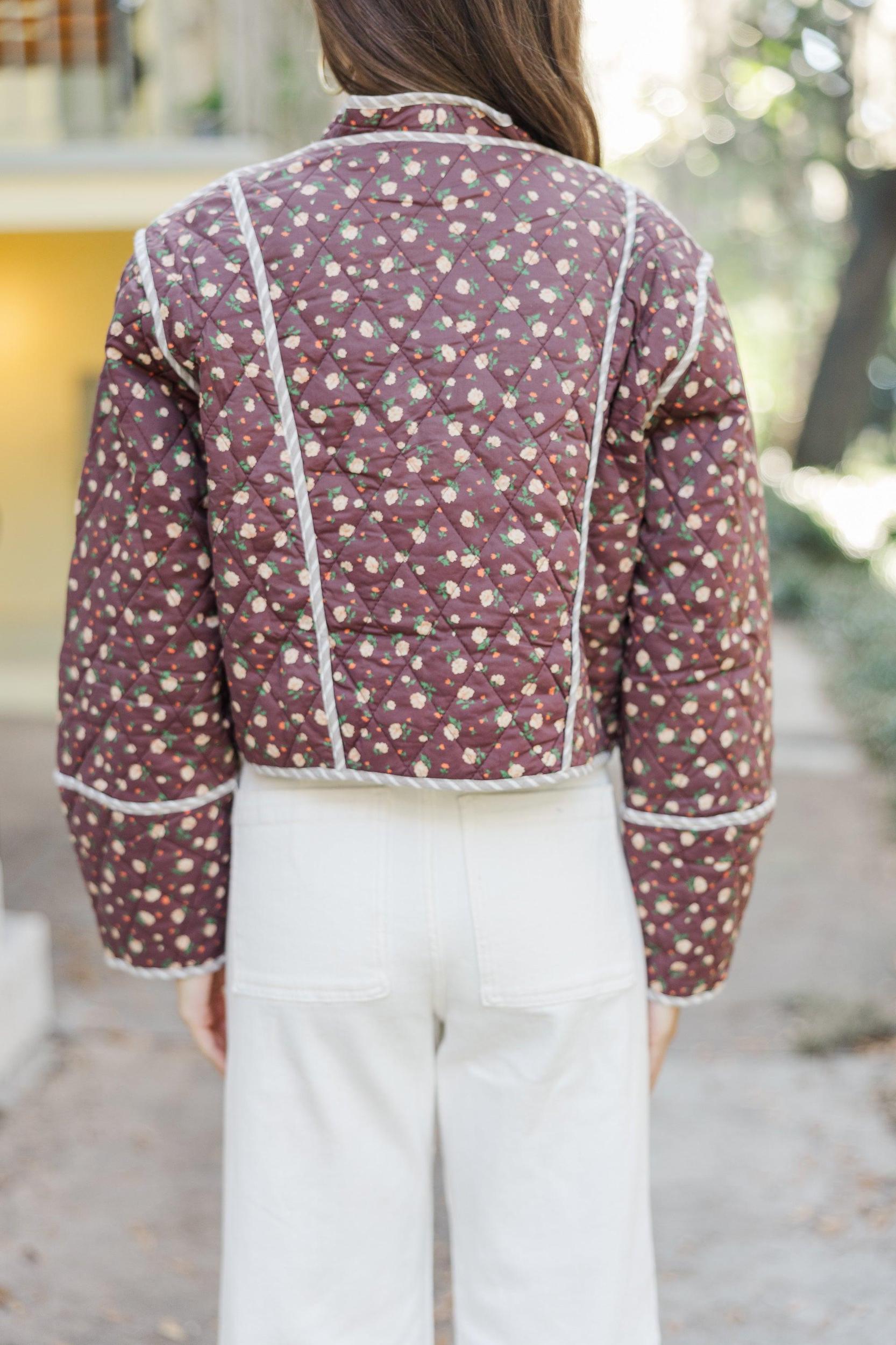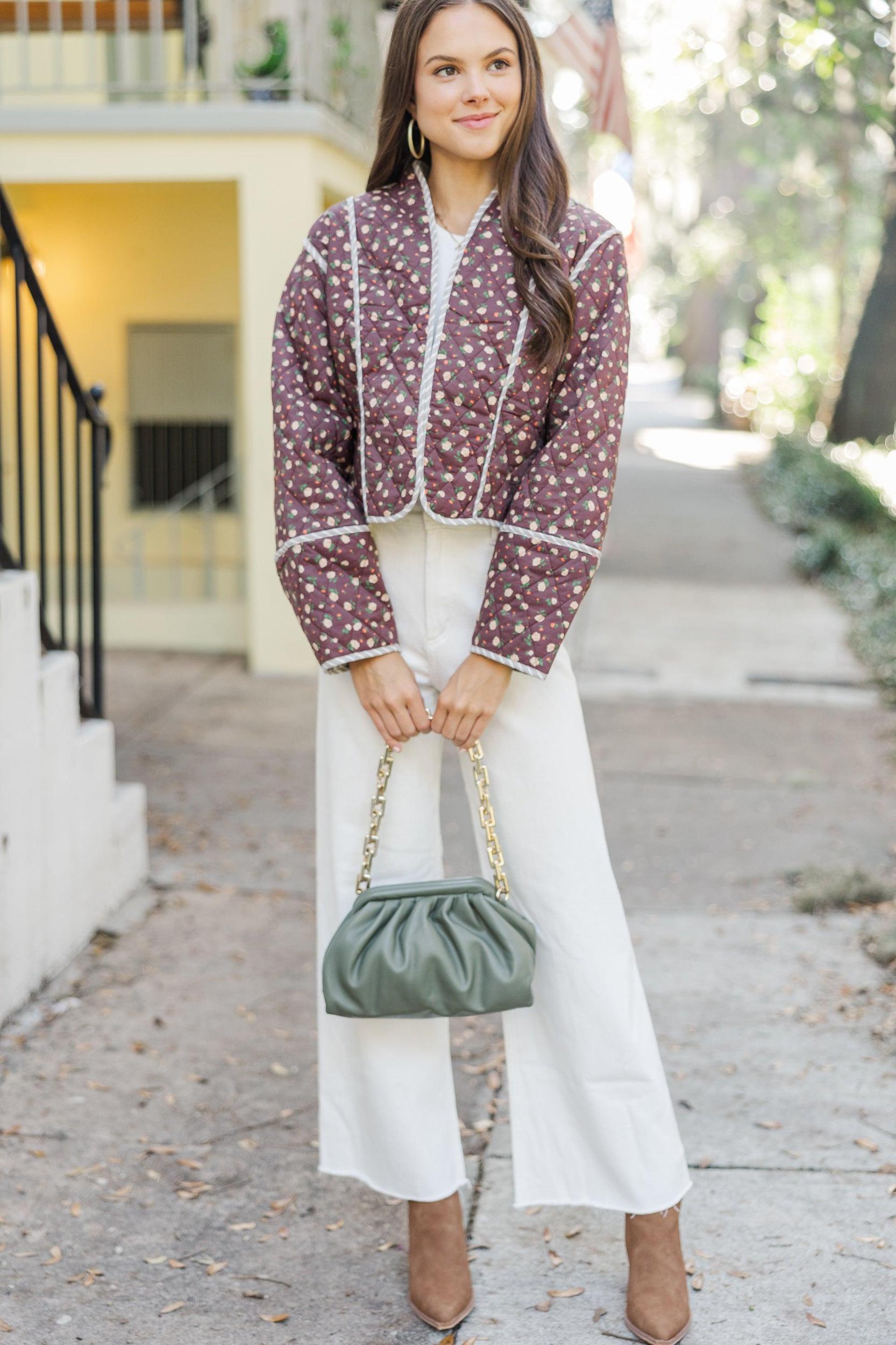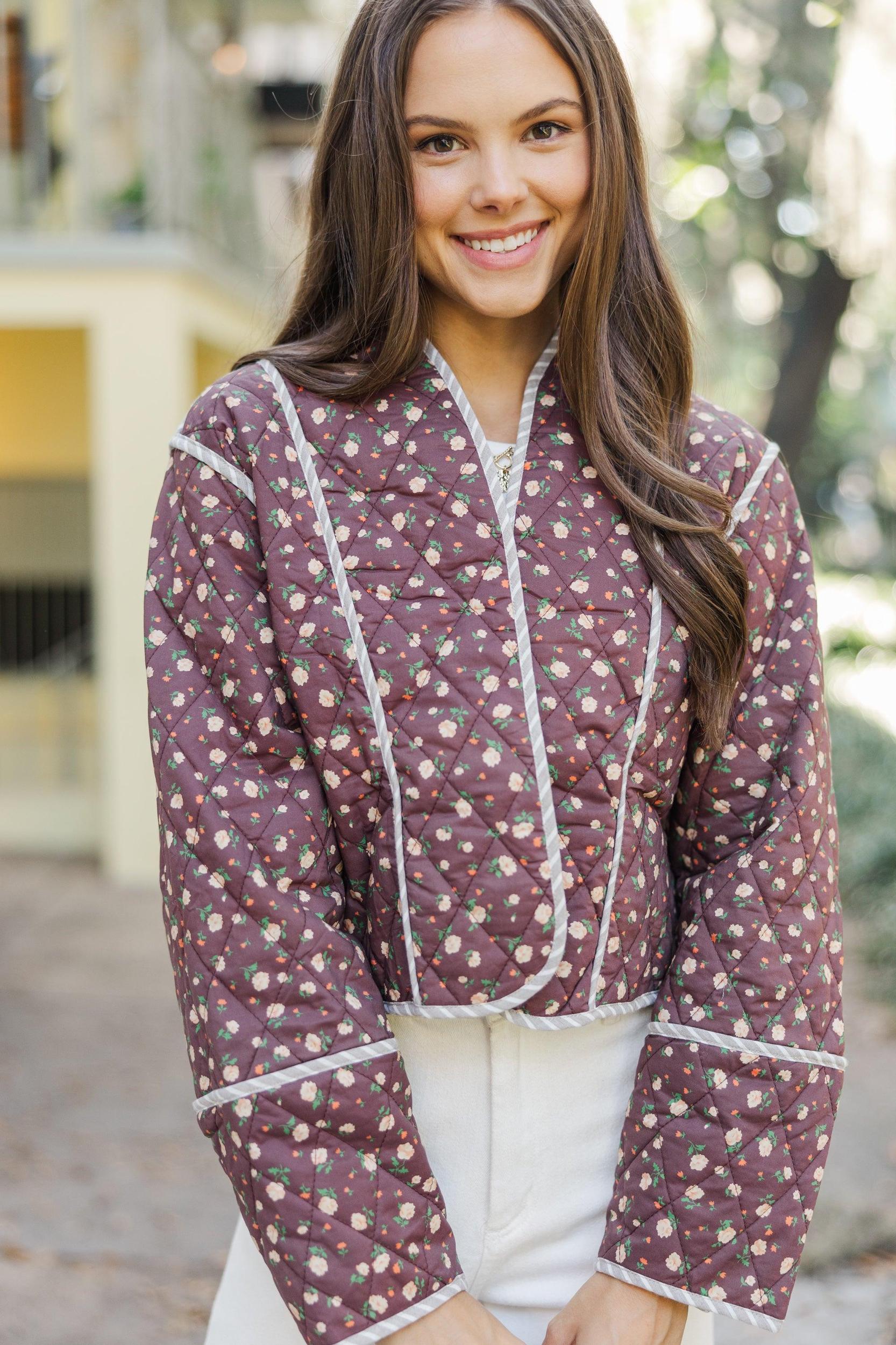 This jacket is perfect for the trendy gal you are! The quilted fabric and those hues are perfect for the fall season! We also really love the slightly cropped hem! Open front Long sleeves Striped piping Ditsy floral print Quilted fabric No stretch Sydney is wearing the small.