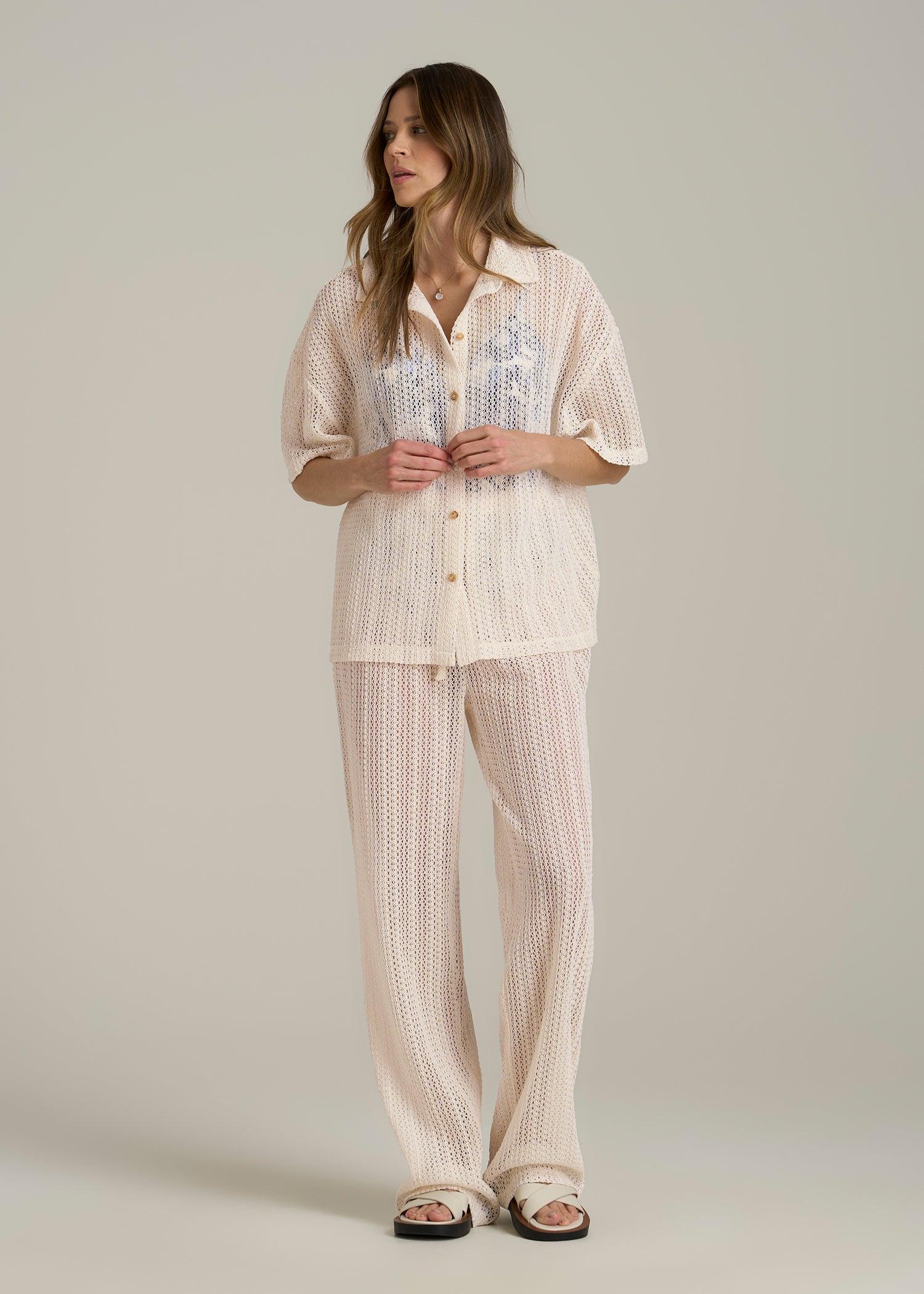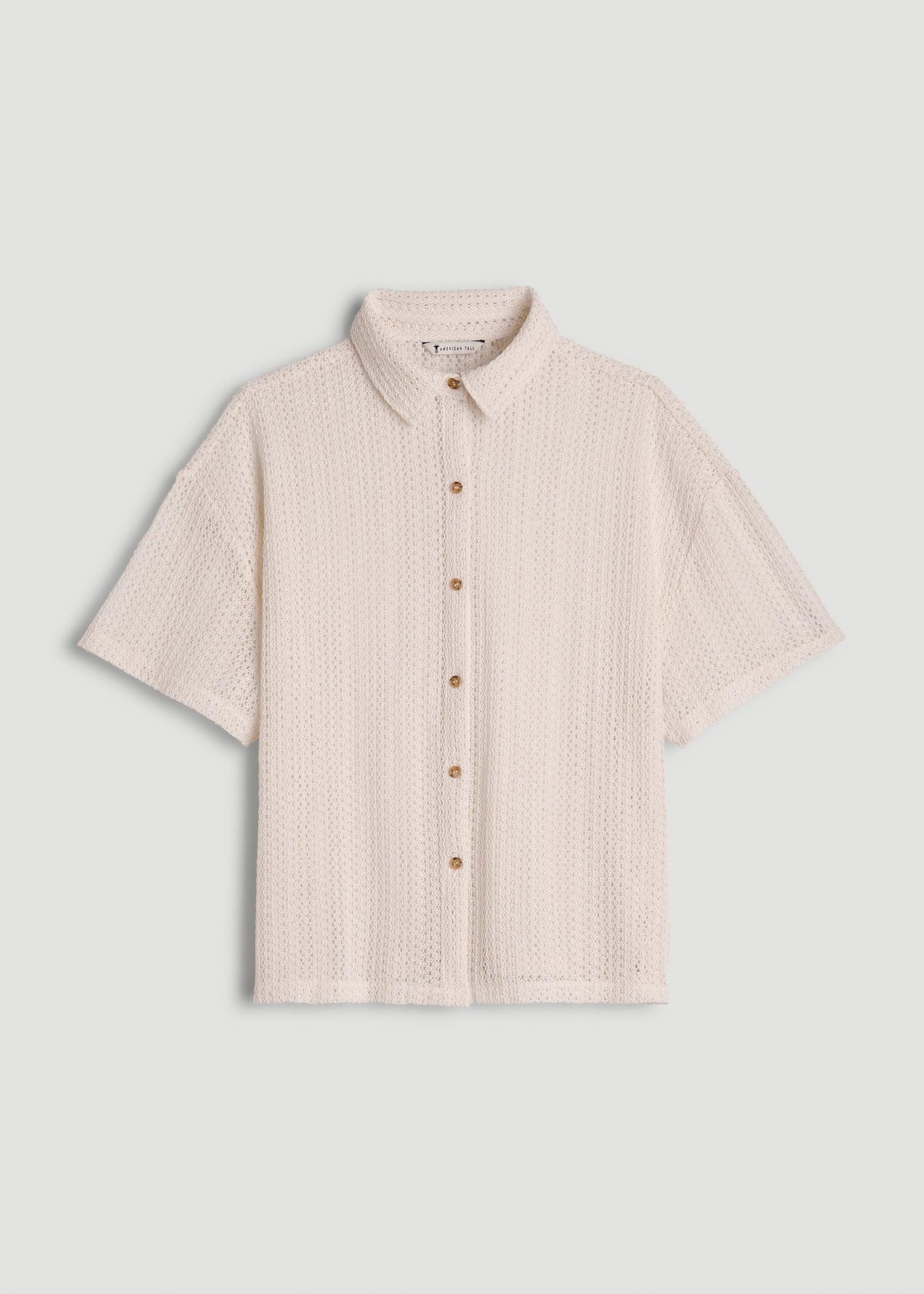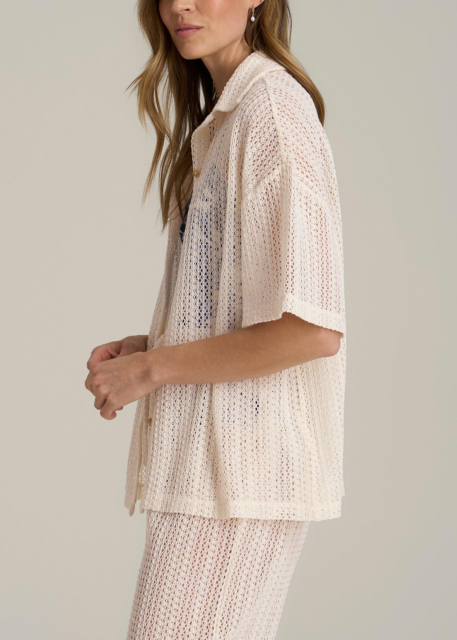 Elevate your beachwear or add a delicate touch to your everyday outfits with our Openwork Loose Knit Top, a versatile women's tall shirt that doubles as a swimwear coverup. This women's tall button-up shirt features open crochet detailing and a relaxed fit that drapes beautifully over your frame.• Open crochet for a light, airy feel• Collared shirt design adds a refined touch to casual wear• Hip length for easy pairing with shorts or skirts
