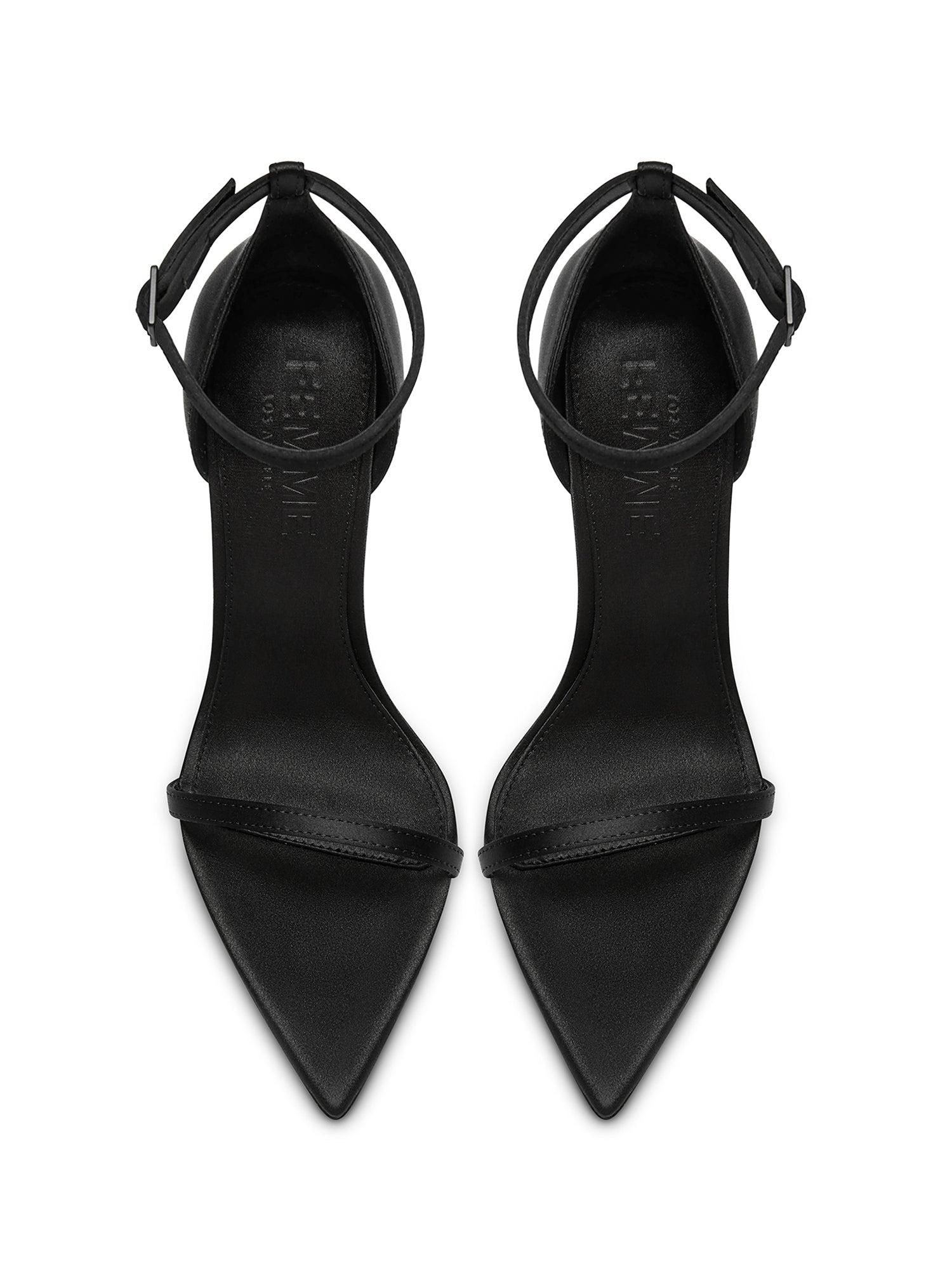Handcrafted in luxurious noir satin, the Opera Sandal is truly a statement piece from every angle. This striking silhouette is an immediate show-stopper and will embolden you with every step you take. Satin upper Vegan Insole Vegan outsole Open pointed toe Adjustable ankle strap Handmade Designed in LA Self-covered stiletto heel, 4.75" (120mm)