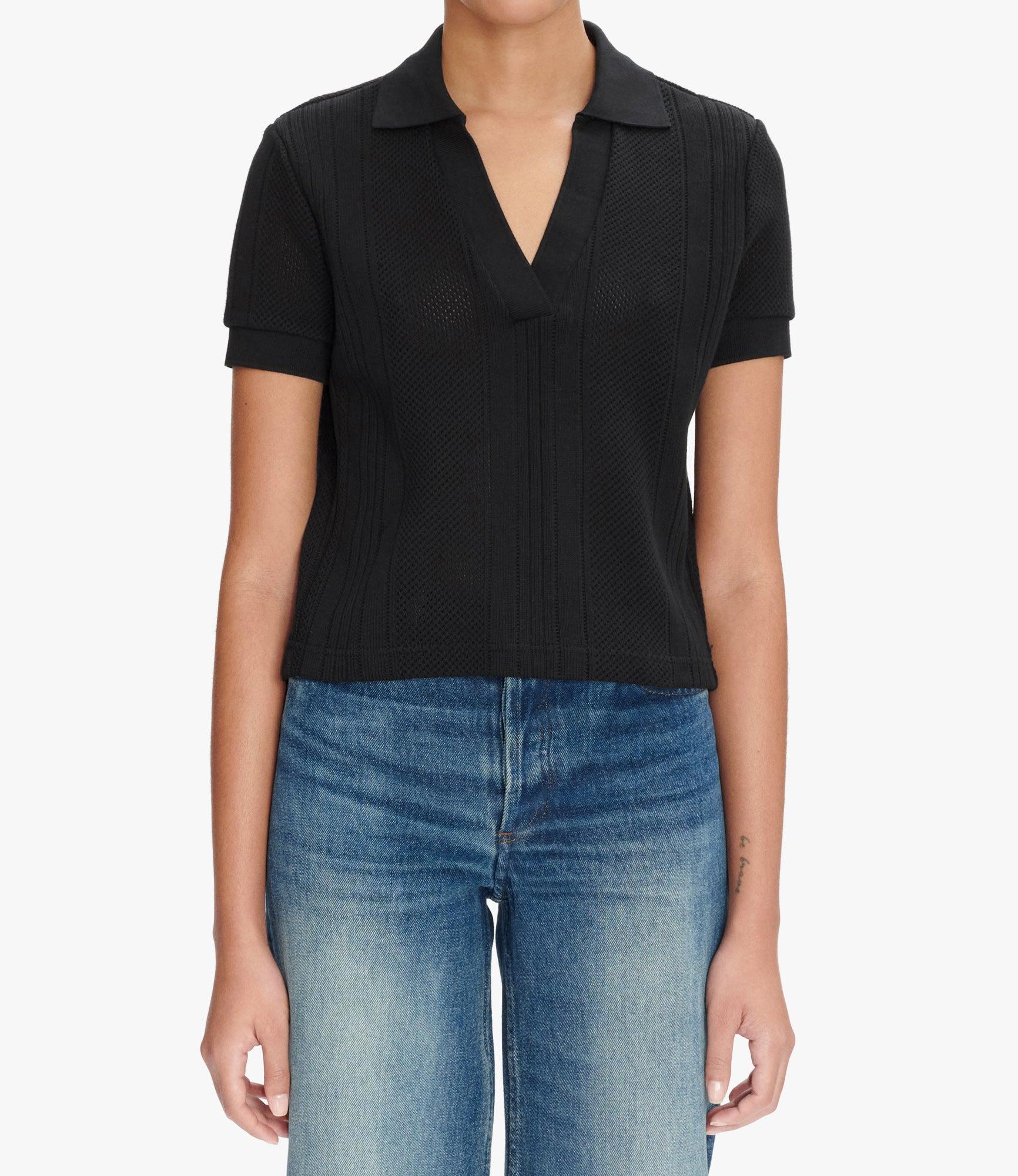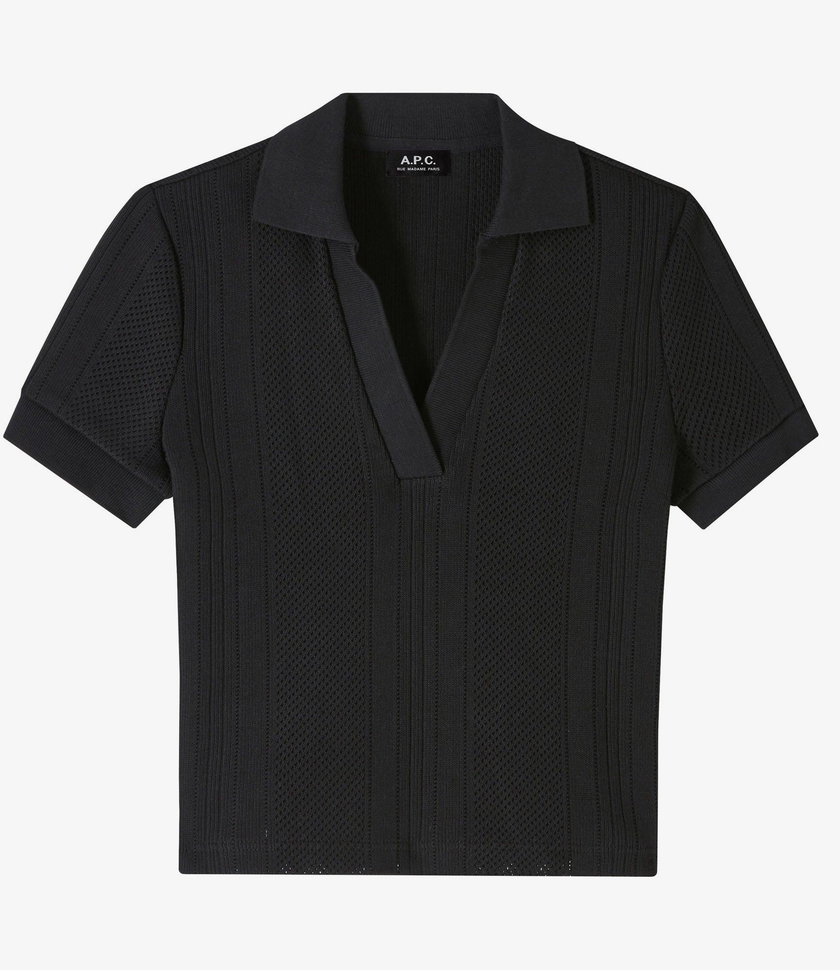 - Heavyweight material with subtle openwork. - Straight, short cut. - V-neck polo shirt collar. - Short sleeves. - This garment is GOTS certified, which guarantees the organic origin of this clothing and the compliance with strict social and environmental criteria throughout the production chain.