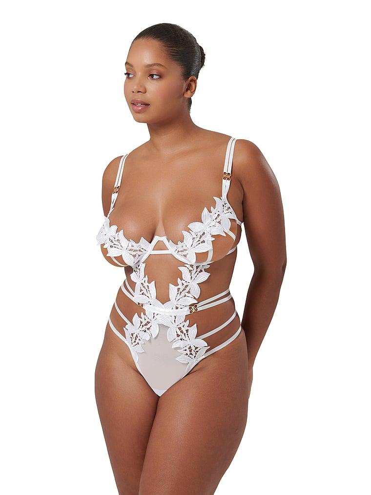 The minimal, strappy frame of this bold one-piece is enhanced with a burst of floral appliqué and light touches of gold-tone hardware.From BLUEBELLA FOR VICTORIA’S SECRET: fashion-forward lingerie with beauty and strength at its heart, combining alluring textures with a dare-to-bare feel that’s designed to redefine sensuality.Lift & LiningLightly-linedUnderwireStraps & HooksAdjustable strapsHook-and-eye back closureDetails & FabricGold-tone hardwareFloral appliqué detailingDouble straps and waistbandsNo coverageHand washImported