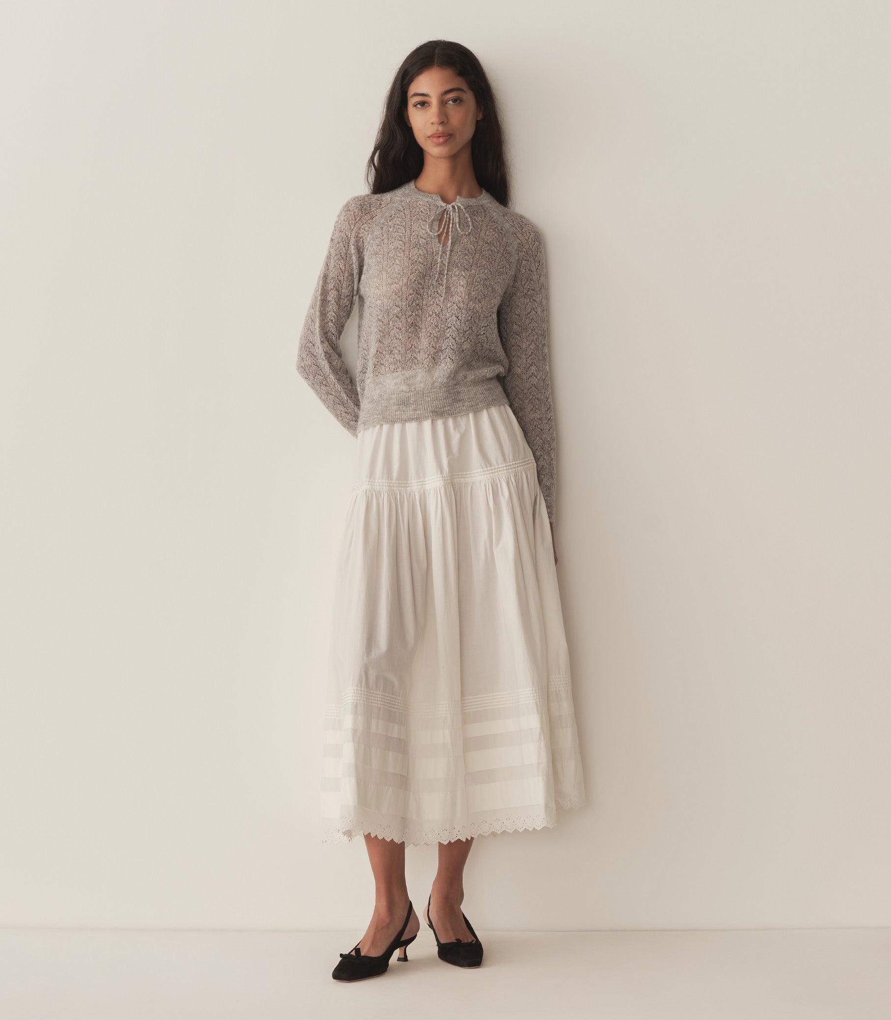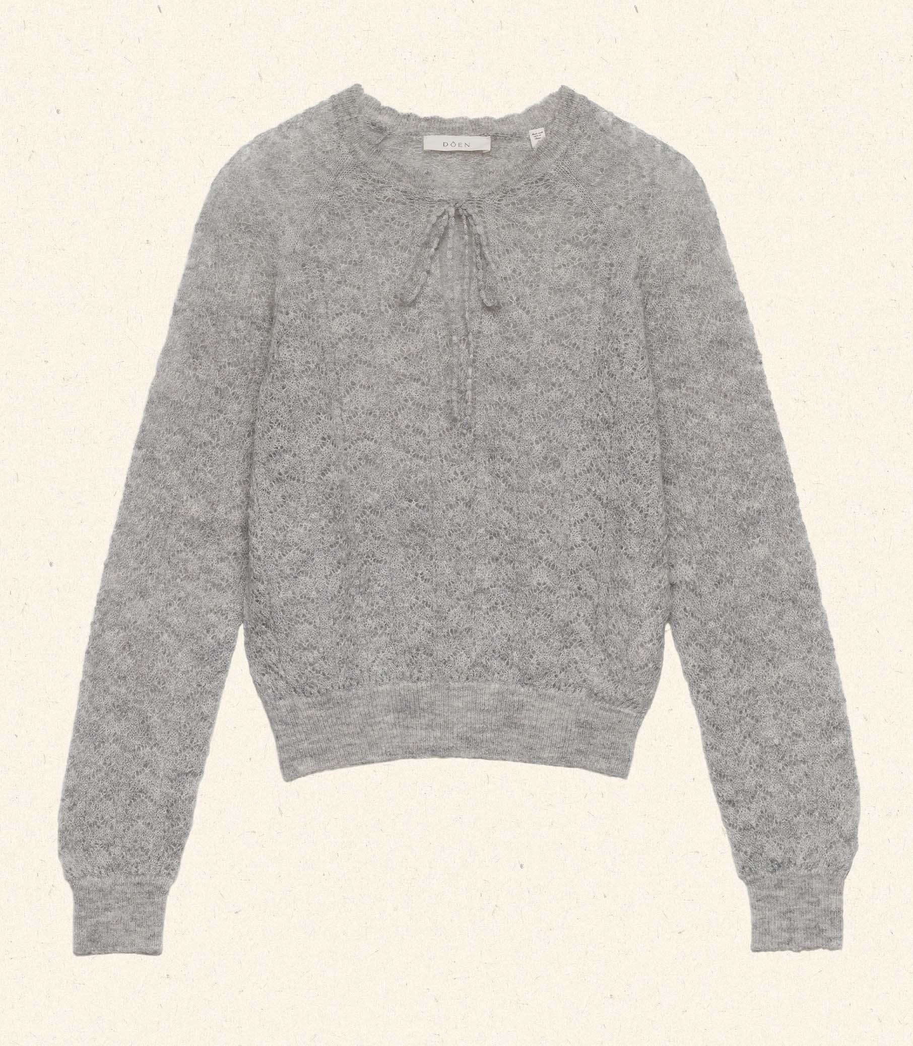 Taking cues from ‘30s knitwear, the Ophira Sweater is crafted from a lightweight wool-alpaca blend with an intricate allover pointelle design, featuring a classic crew neck, full-length raglan sleeves, and an antique-inspired delicate tie detail at the neckline.