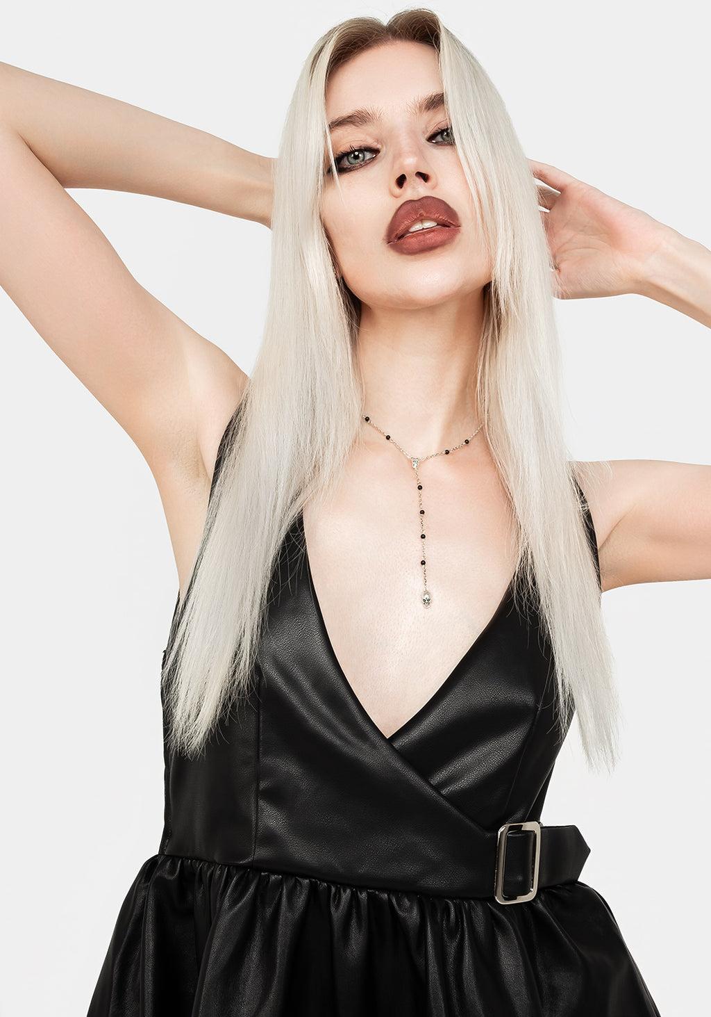 Hit me up sometime- Black faux leather buckled mock wrap mini dress - Fit ‘n’ flare shape with pleated mini-length skirt - Faux-wrap front (with decorative silver sliding buckle) forms a dramatic plunging V-neckline - Sleeveless finish opens up layering possibilities - Silver side zipper for easy dressing - Soft, flexible PU leather with plush, soft-touch lining - Layer with mesh or lace bodysuits for a symphony of textures - There’s nothing quite like it... Main: 50% PU, 50% polyesterLining: 95% polyester, 5% elastane