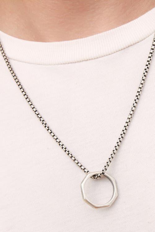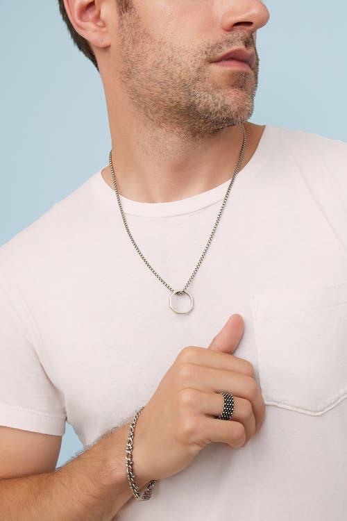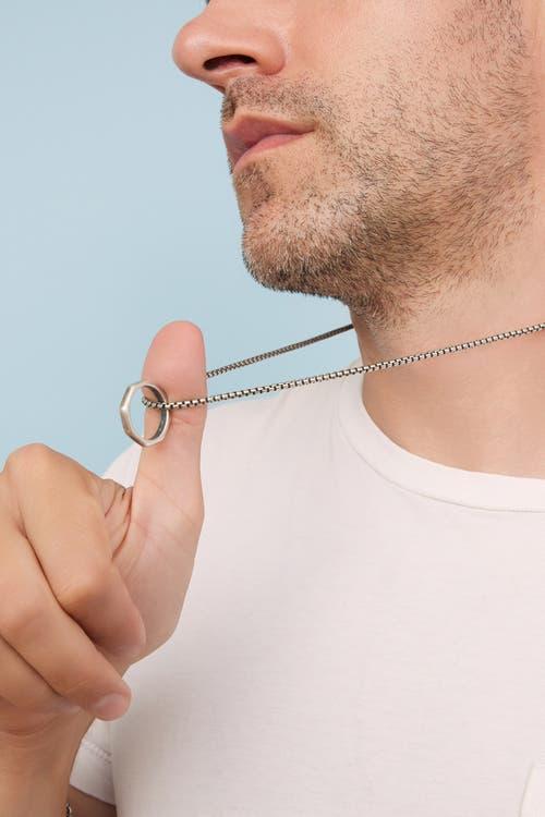 Our Bolt Pendant Necklace combines industrial edge with timeless sophistication. Crafted in Italy, it features a hexagonal pendant suspended from a bold, round box chain exhibiting both style and strength. Metal: Sterling Silver Finish: Oxidized Weight: 22.5 grams Pendant Dimensions: 22mm Diameter Origin: Crafted in Vicenza, Italy