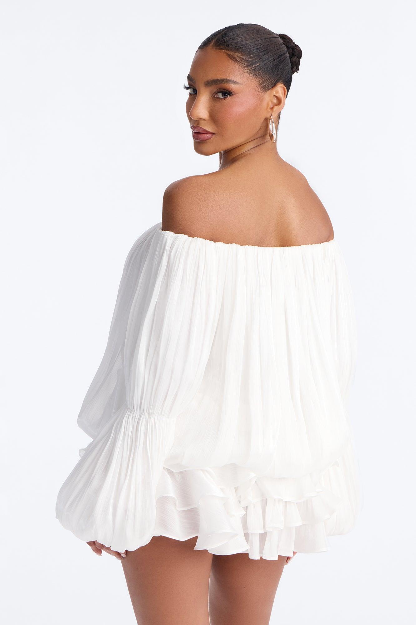 Available In Black And White. Organza Mini Dress Off Shoulder Long Balloon Sleeve Pleated Ruffle Hem Stretch Length Measured Flat = 26" Self: 100% Polyester Lining: 100% Polyester Imported