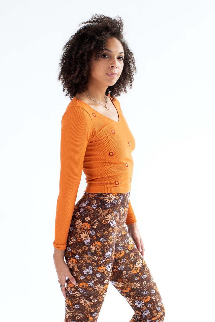 Orange Floral Embroidered Seamless V-Neck Shirt