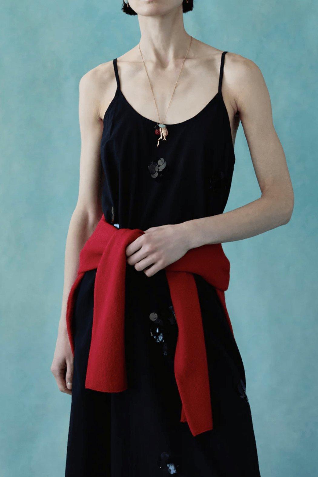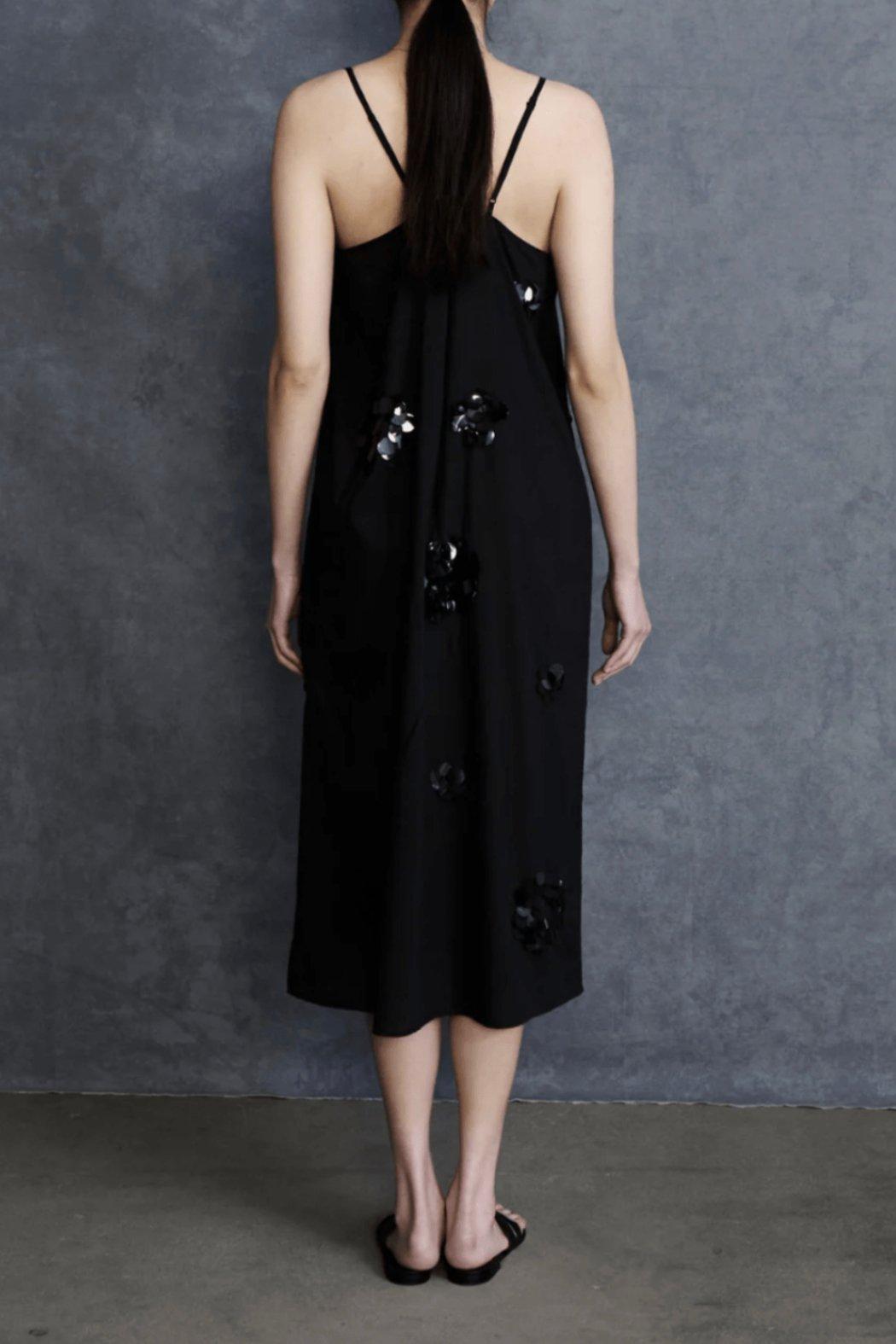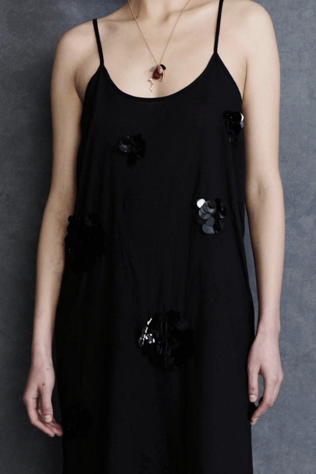 The Orb Slip Dress radiates timeless chic. The woven cotton fabric is adorned with sequin embroidery that catches the light, lending this minimalist style a touch of elevated glamour.
