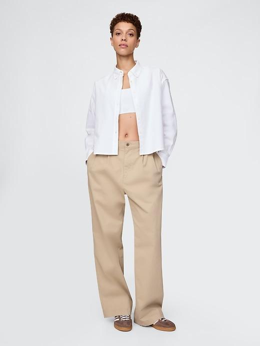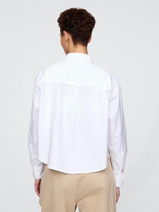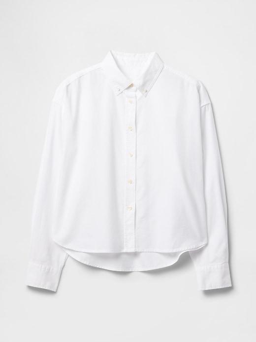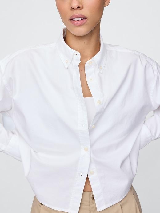 Soft cotton oversized oxford shirt with a cropped fit. Point collar, button front. Long sleeves. Made with 100% organically grown cotton, which is grown without the use of synthetic pesticides and fertilizers. #702890