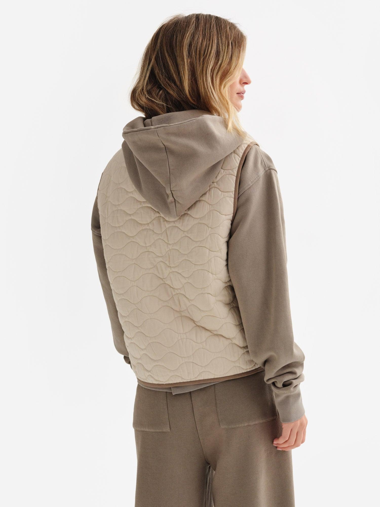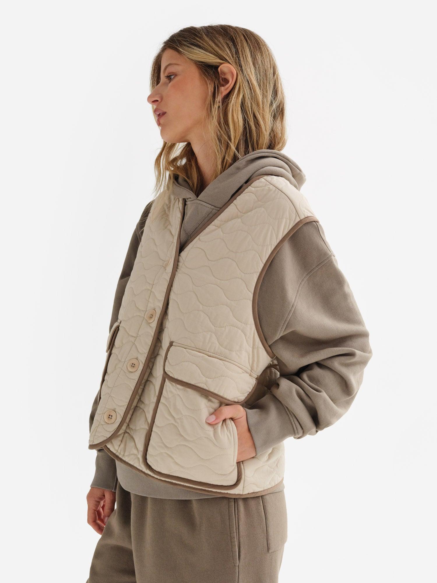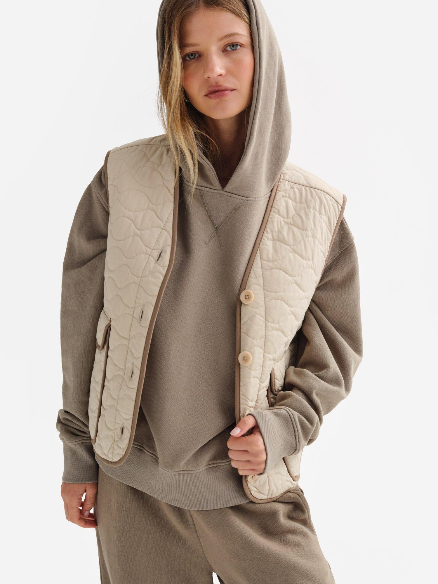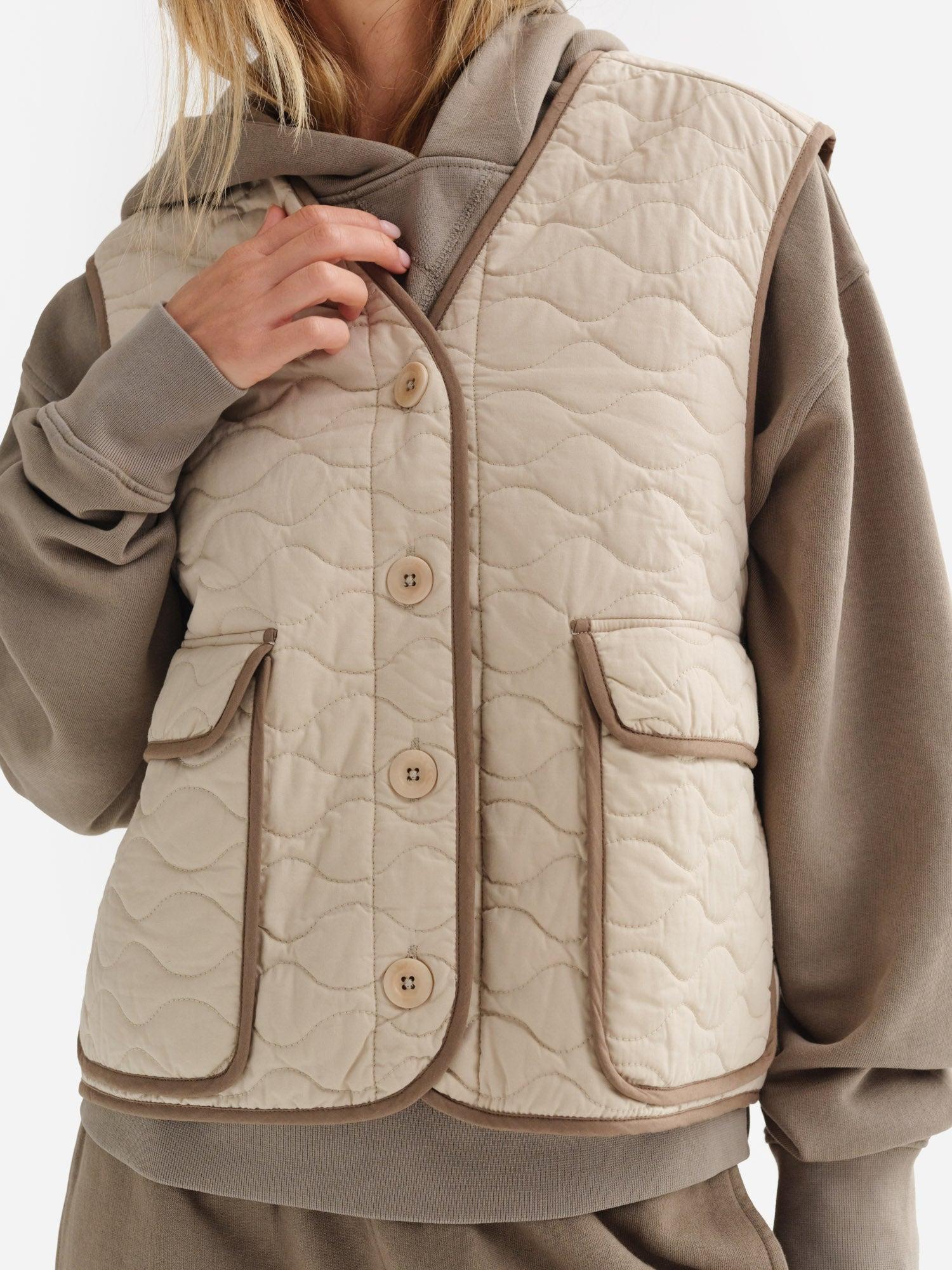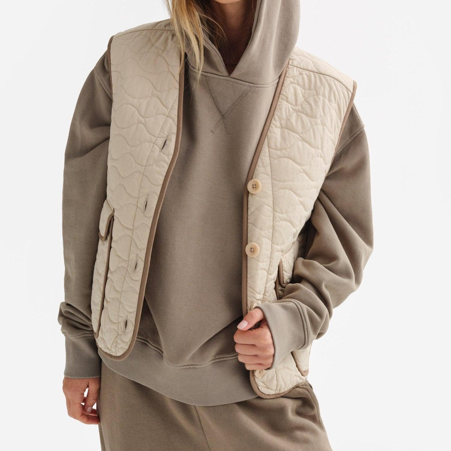 Organic Cotton Quilted Vest filled with Kapok - a vegan, moisture resistant and warm down alternative material. Kapok is harvested from the wild seed pods of indigenous plants. Features deep pockets and button closure. Made in a GOTS-certified factory in India with 100% Organic Cotton and lined with 100% Tencel™. - Outer Shell: 100% Organic Cotton- Filling: 100% Kapok- Lining: 100% Tencel™ - Dry clean onlyPlease note that there can be slight differences in the coloration of our products across different fabrications. To ensure no color discrepancy in your set, we recommend that you opt for purchasing a set in the same fabric. Measurements - True to Size - XS : Chest 39 in; Length 21 in- S : Chest 41 in; Length 22 in- M : Chest 43 in; Length 23 in- L : Chest 45 in; Length 24 in- XL : Chest 47 in; Length 25 in Cost Per Wear- 5 Wears : $33.60 - 10 Wears : $16.80 - 25 Wears : $6.72 - 50 Wears : $3.36