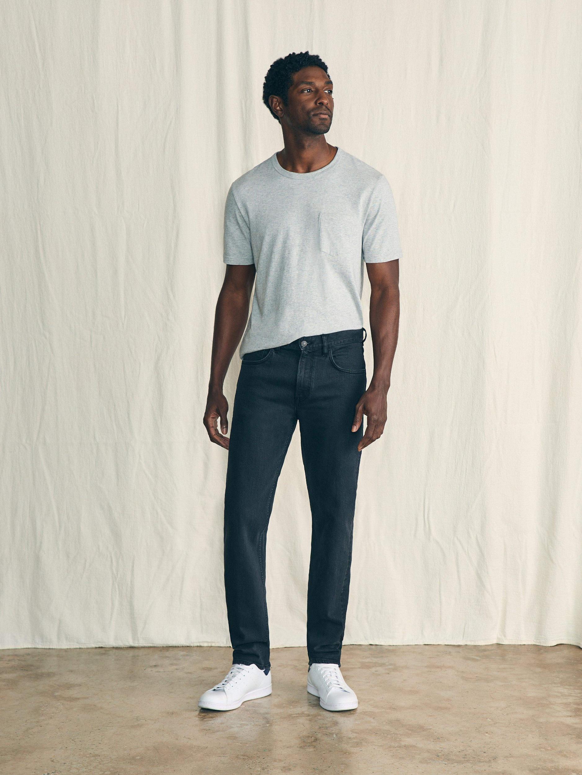 You’ve been asking for denim done our way and we’re stoked to bring it to you with the same high-quality, authentic style and legendary comfort we’re known for. We spent years developing the perfect denim fabric—organic cotton woven with a textured slub yarn that washes down and ages beautifully. Combined with just the right amount of stretch, they’re the most comfortable and lived-in jeans you’ve ever felt, from the first wear. Ours are responsibly designed too, with an innovative, energy-efficient wash process that utilizes 80% less water than conventional denim wash methods. This just-right fit is comfortable enough for all-day wear, yet tailored enough for a night out. Fit: Classic fit. Front rise: 10 3/4", Inseam: 34" Detail: Denim 5-pocket Slim Straight jean. Mid-rise waist that's fitted through the hip and thigh, with straight leg that tapers slightly to the leg opening. comfort stretch. Clean black wash with slightly faded edges. Material: 98% Organic Cotton, 2 % Lycra Model: Jamal is 6’2 wearing size 32" Care: Close all zippers before wash. Turn inside out. Machine wash cold with like colors. Delicate cycle. Do not bleach. Tumble dry low. Remove promptly. Warm iron when needed. MDF2311-BSE
