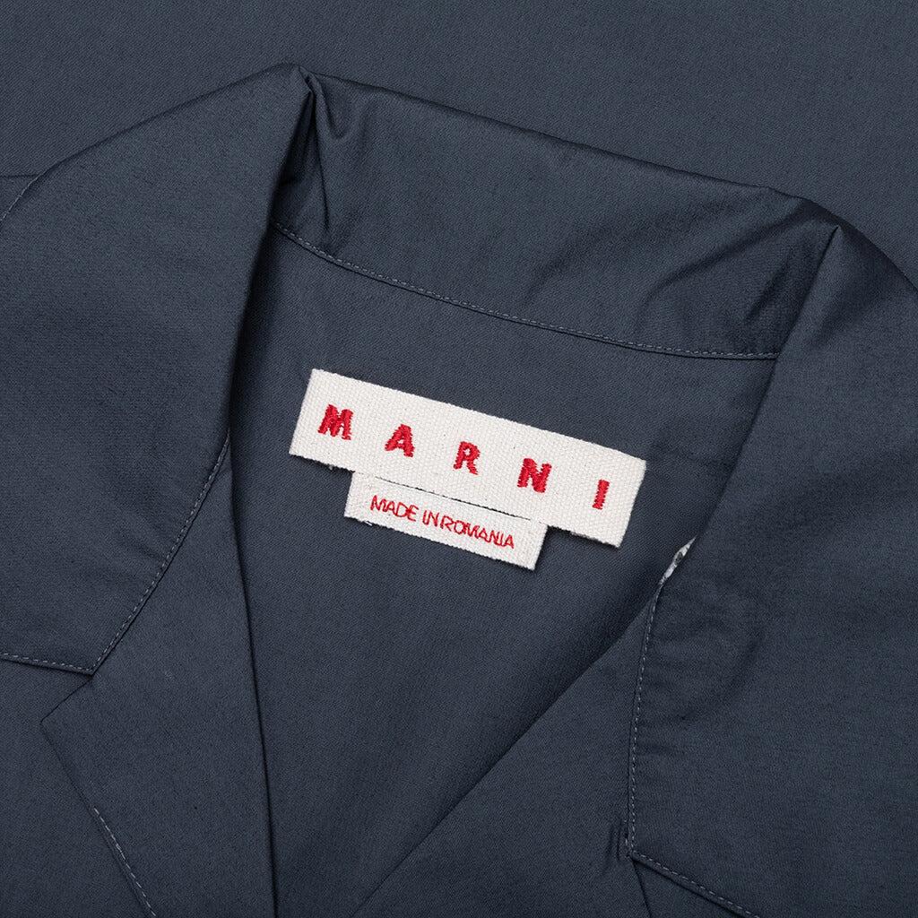 The Marni Poplin Bowling Shirt with Hidden Logo in Dark Ash is crafted from an organic cotton poplin, offering breathability with a touch of stretch for added comfort. The classic button-down design and boxy fit with straight-cut hem create a sharp, flattering silhouette. The subtle Marni logo on the pocket adds a refined signature detail. Organic cotton poplin blend Button-down design with a slim fit Subtle Marni logo on the pocket Pointed collar Style No: CUMU0213P8 USCT88 LON63